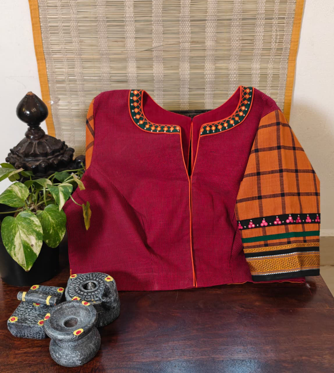 🧵 Kandangi checks in fiery red meeting soulful green rails ✨ Hand-stitched Kutch motifs blooming on textured cotton 🌿 Sustainable • Handmade • Limited weave story 🪡 Slow-crafted patterns, sewn to travel across traditions
