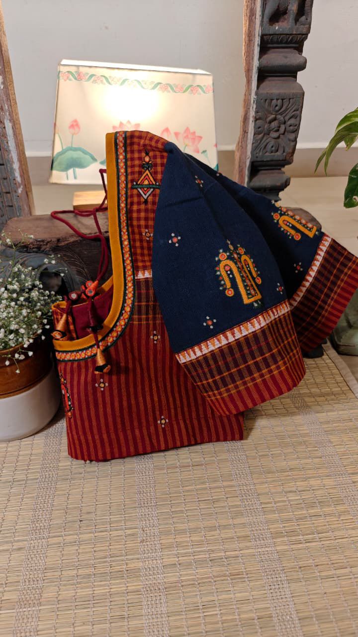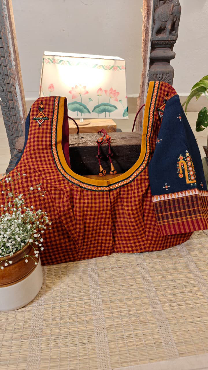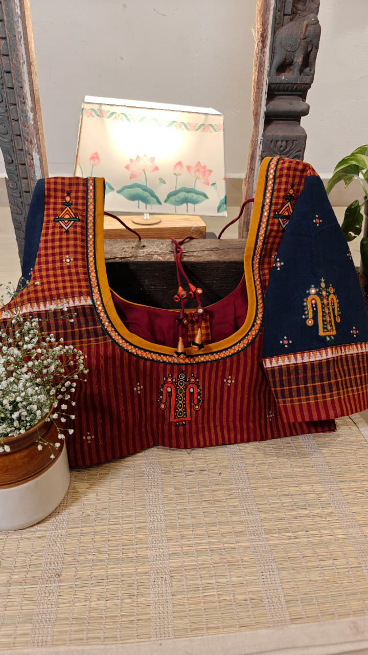 Pure Kandangi checks in rich handloom cotton, detailed with traditional motifs embroidered on the blue sleeves and back. A timeless Svasa classic that carries the heritage of our looms in every thread.