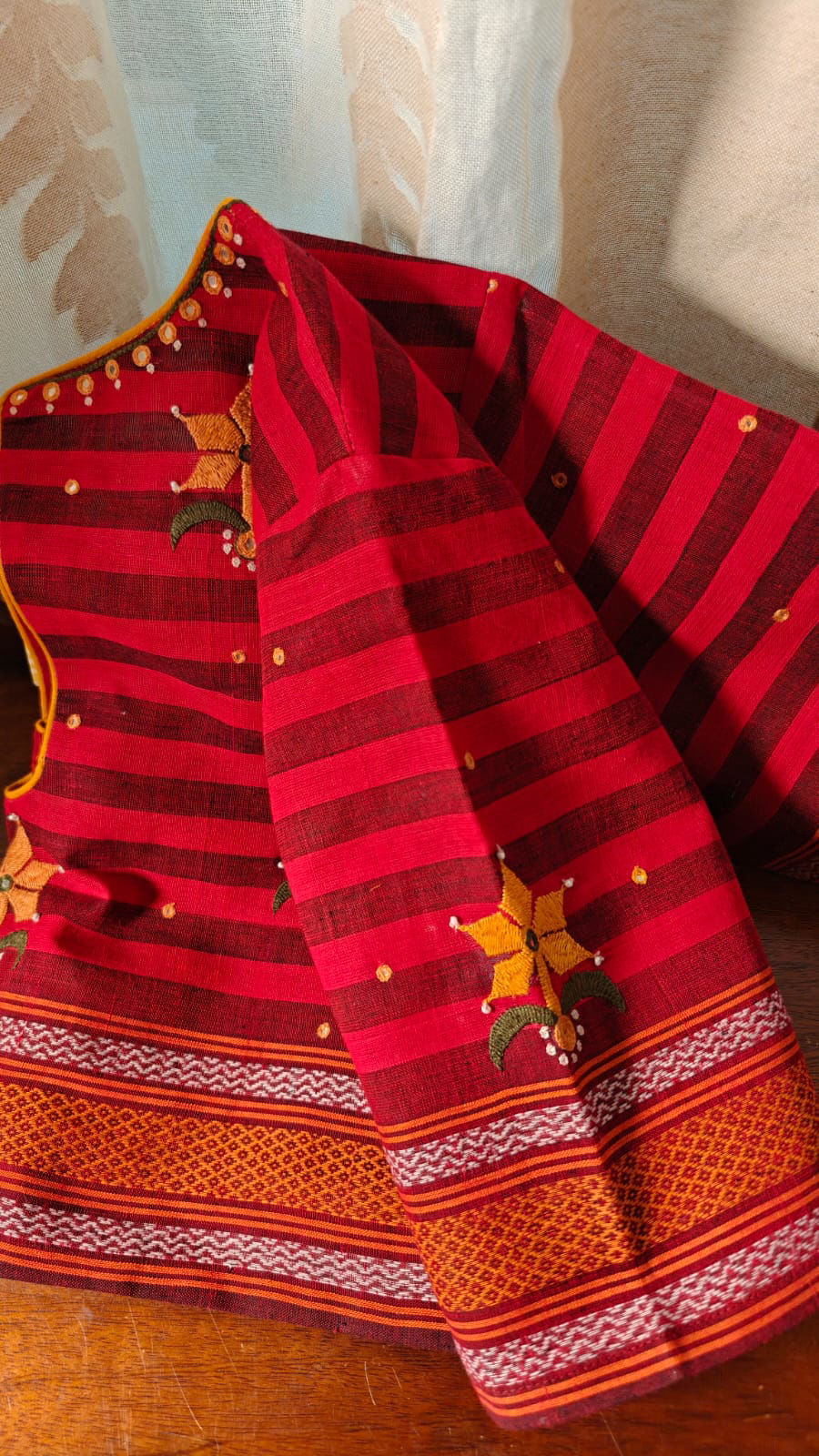 Our artisans creatively hand embroider, hand paint and hand print the blouses that come to you from the design house of SVASA. We use hand woven fabric extensively. You may notice very minute, almost insignificant flaws in the crafts since they are all handmade. We urge our patrons to overlook a few human errors that may have occurred in the process. Our aspirations are towards an empowered society, focusing on keeping traditional needlecraft alive for a long time to come.