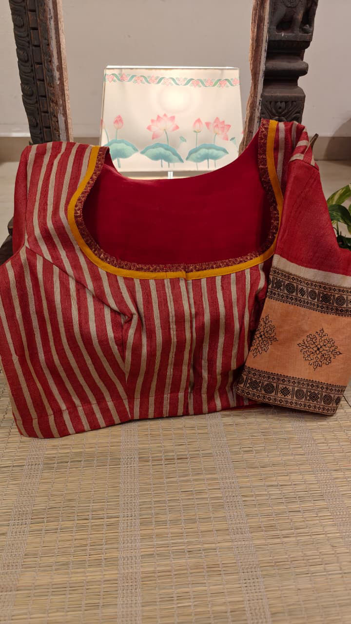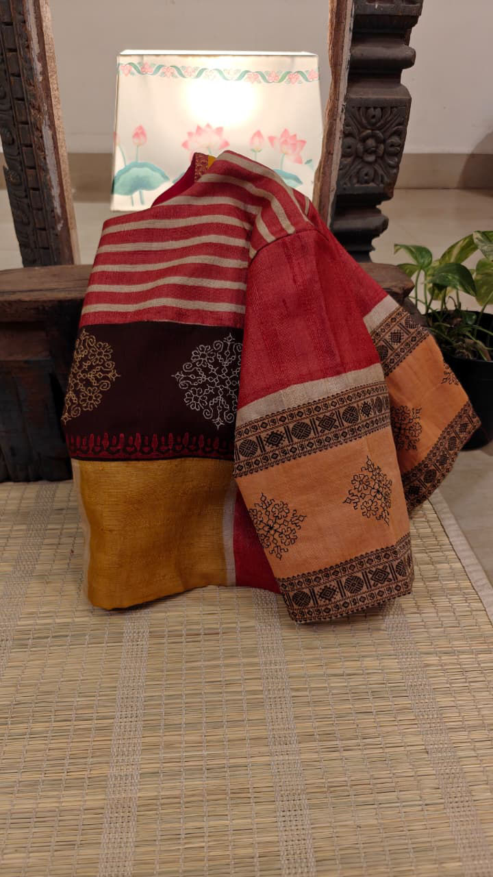 Layers of red, brown, and ochre come together on pure tussar silk, adorned with intricate Kasuti embroidery from the revival clusters of Hubli. Rooted in tradition, patient in detail, and rich in soul—this piece carries the quiet strength of heritage, handcrafted the Svasa way.