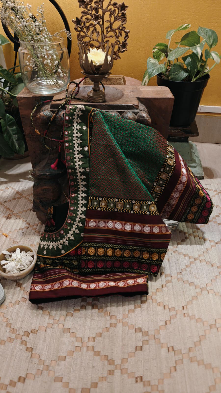 Crafted in timeless Kanchi cotton, this piece is framed with bold tribal borders that lend strength and character to its simplicity. The richness of the weave meets the raw beauty of indigenous motifs, creating a balance