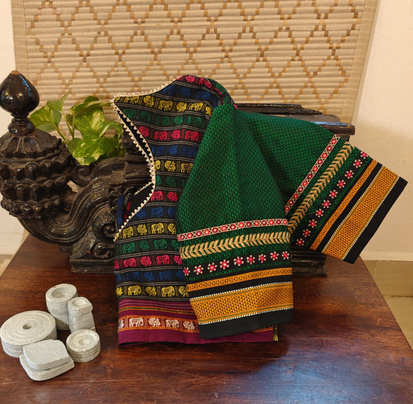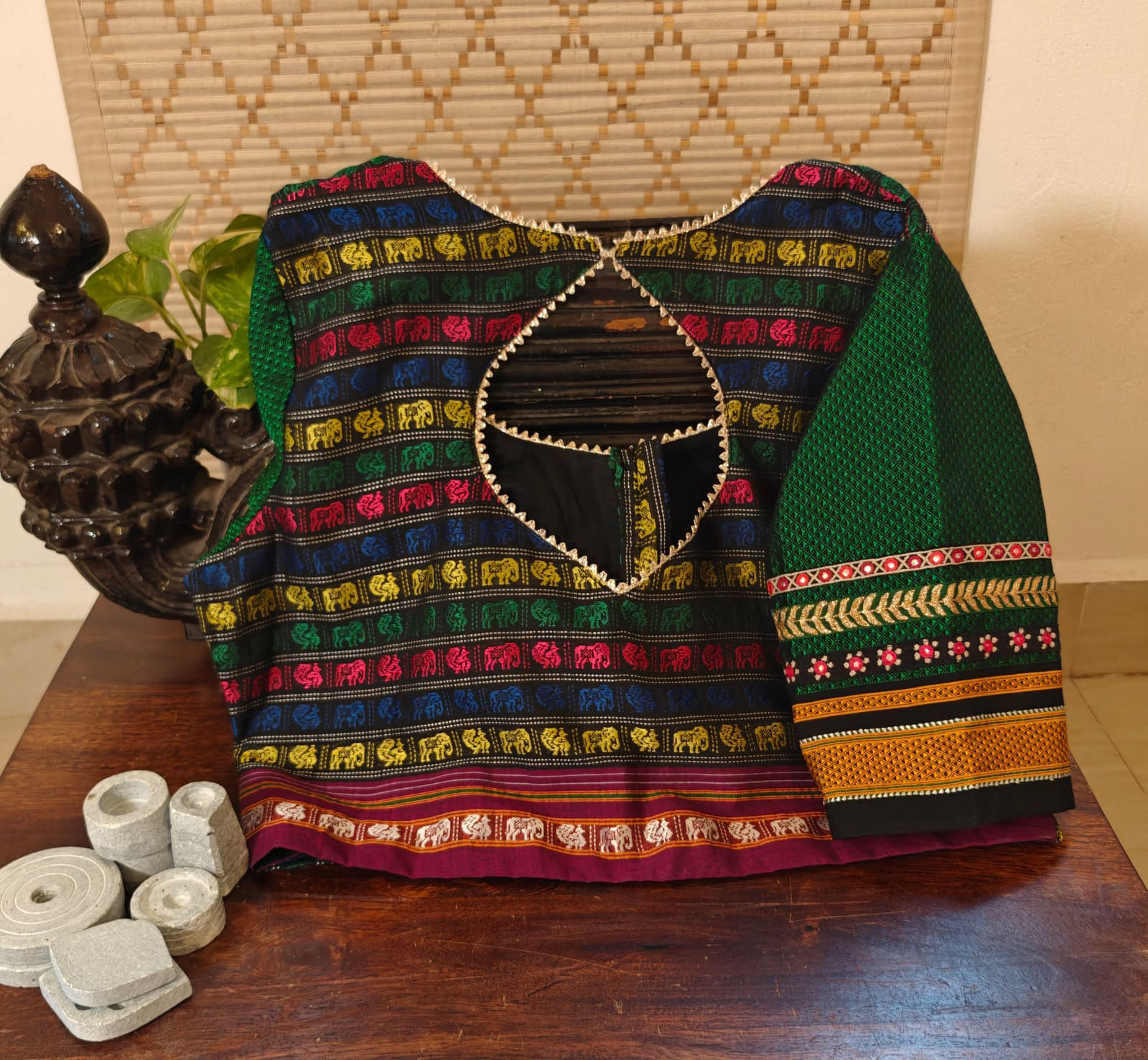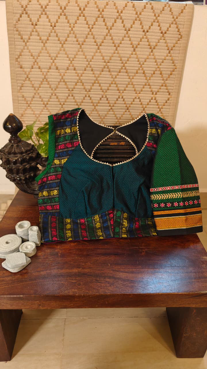 A colourful khun weave shaped into a blue choli cut, bringing structure and vibrance together. The embroidered sleeves add a crafted finish, highlighting the joy of handwork and folk-inspired detail. Bold yet balanced, this piece celebrates colour, form, and the beauty of thoughtful making.