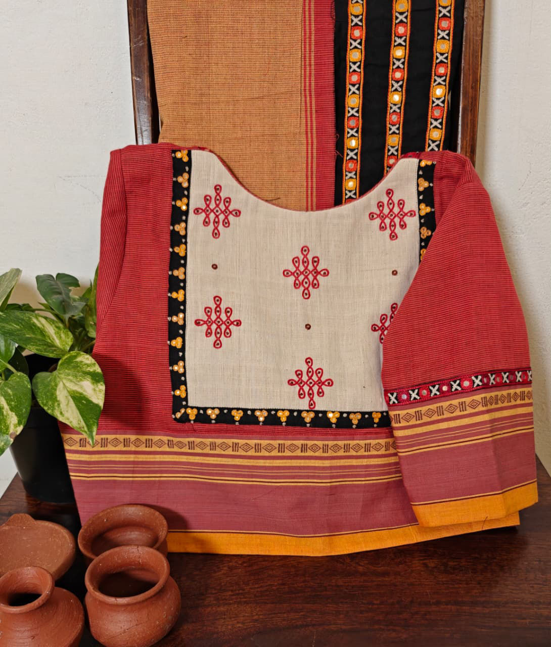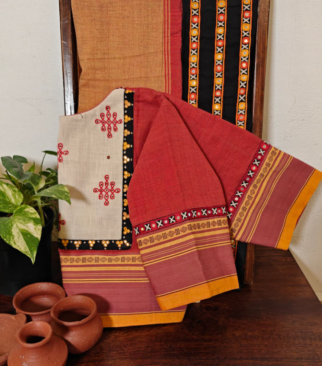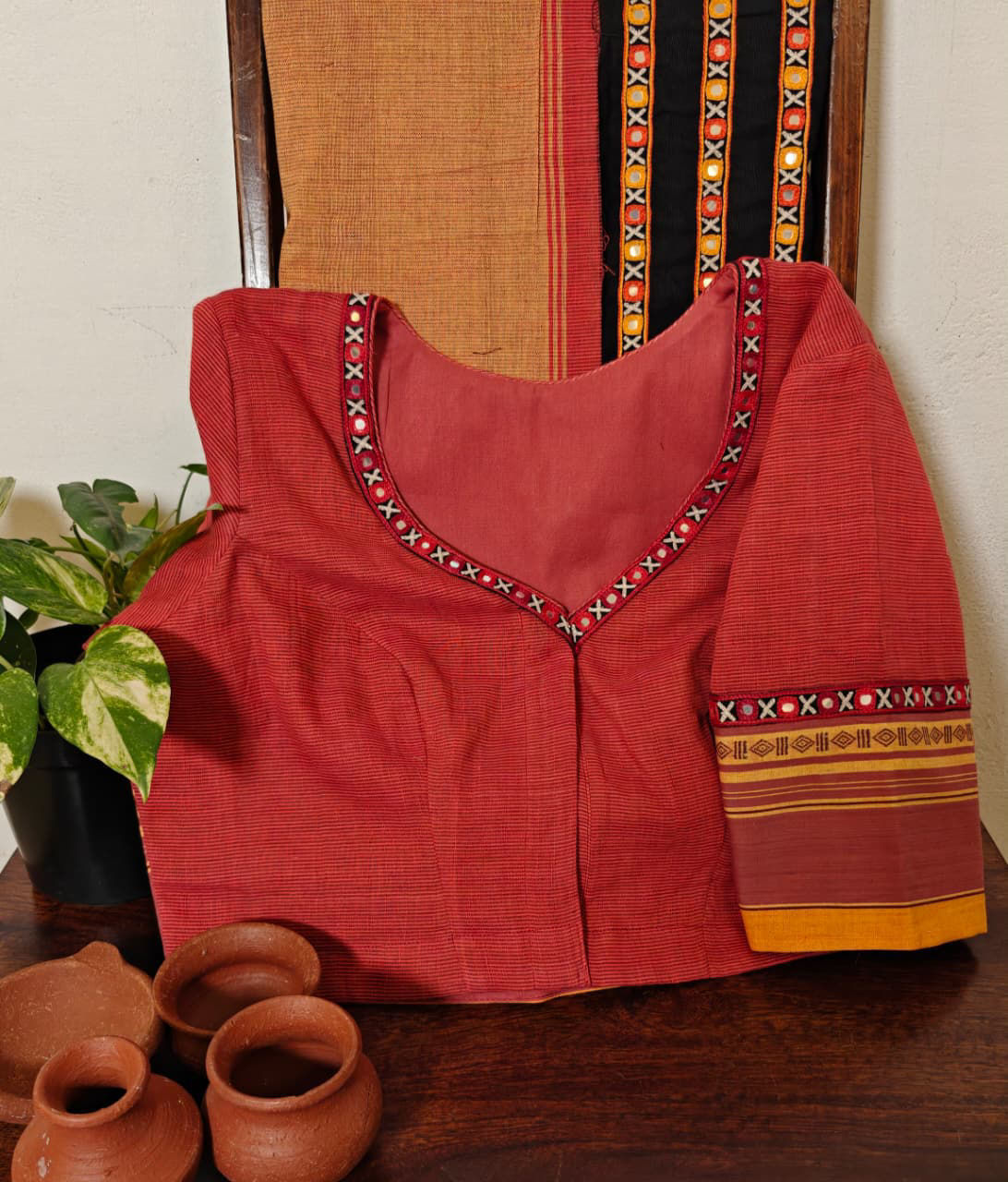 Our artisans creatively hand embroider, hand paint and hand print the blouses that come to you from the design house of SVASA. We use hand woven fabric extensively. You may notice very minute, almost insignificant flaws in the crafts since they are all handmade. We urge our patrons to overlook a few human errors that may have occurred in the process. Our aspirations are towards an empowered society, focusing on keeping traditional needlecraft alive for a long time to come.