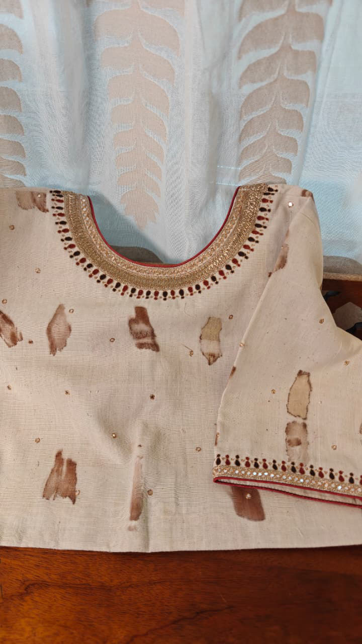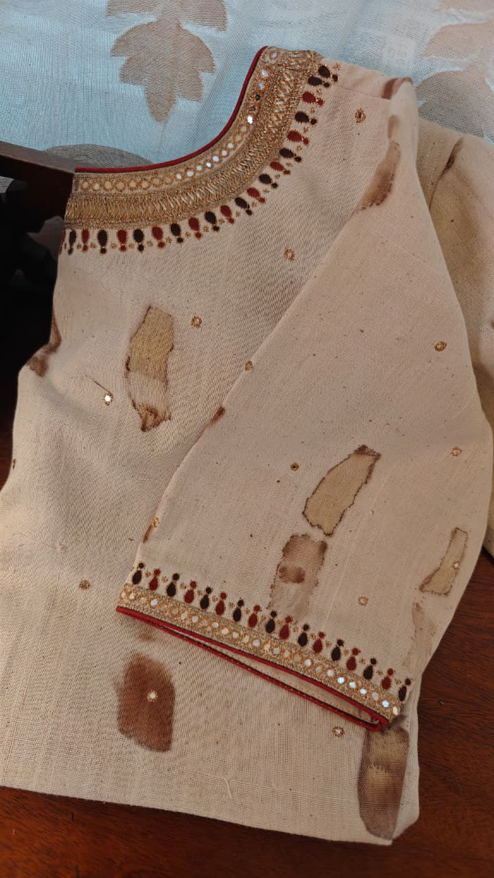 Eco-dyed and hand-printed on soft khadi, with natural leaves creating a quiet, earthy story. Finished with antique gold embroidery, and a subtle pop of garnet and olive threads — understated, rooted, and unmistakably Svasa