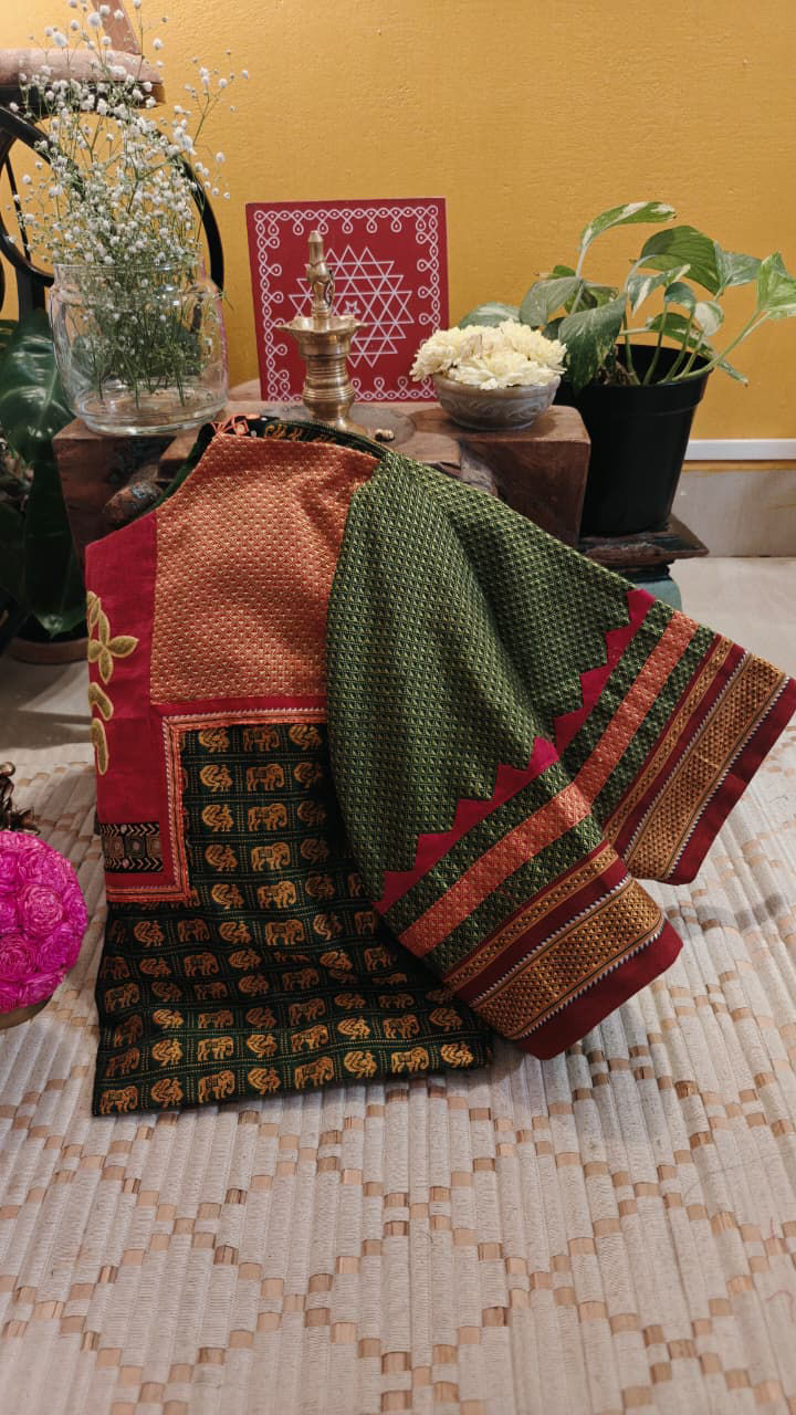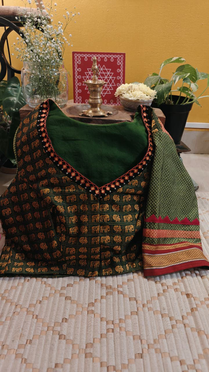 A celebration of colour and craft, this multi-colour Khun blouse brings together vibrant weaves with timeless detailing. The yoke becomes the focal point, adorned with a thoughtfully placed motif that adds character and quiet storytelling to the piece. Rich in tradition yet effortlessly versatile, this blouse pairs beautifully with both classic and contemporary sarees — a true reflection of handcrafted elegance.