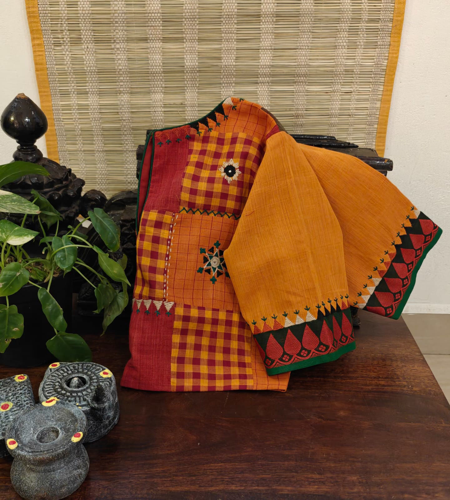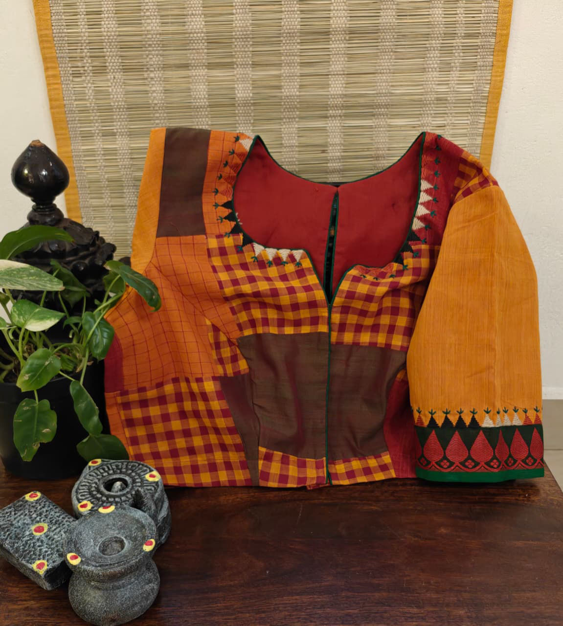 Our artisans creatively hand embroider, hand paint and hand print the blouses that come to you from the design house of SVASA. We use hand woven fabric extensively. You may notice very minute, almost insignificant flaws in the crafts since they are all handmade. We urge our patrons to overlook a few human errors that may have occurred in the process. Our aspirations are towards an empowered society, focusing on keeping traditional needlecraft alive for a long time to come.
