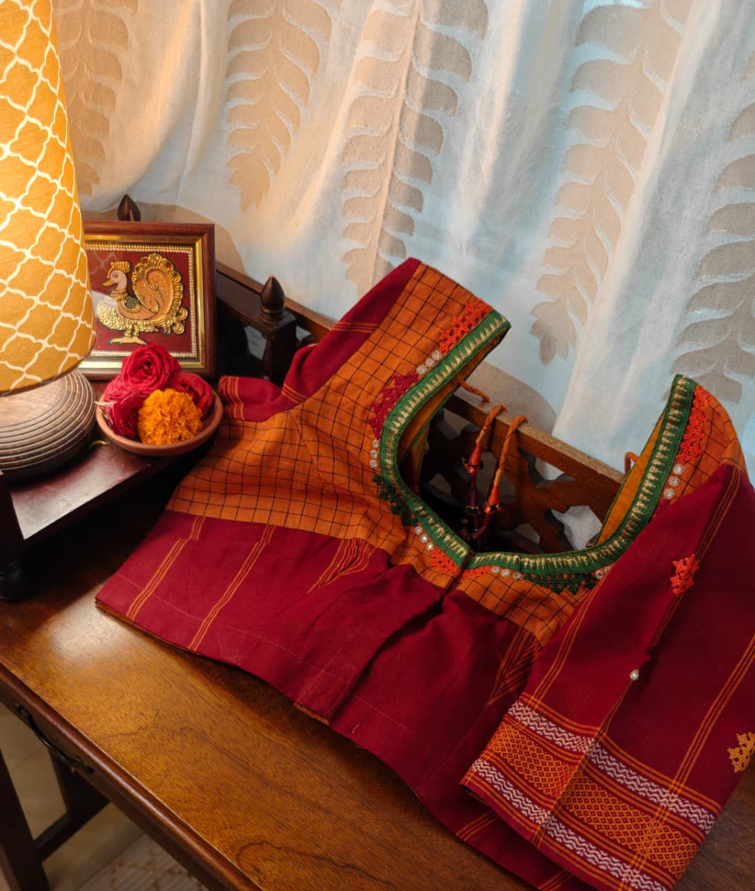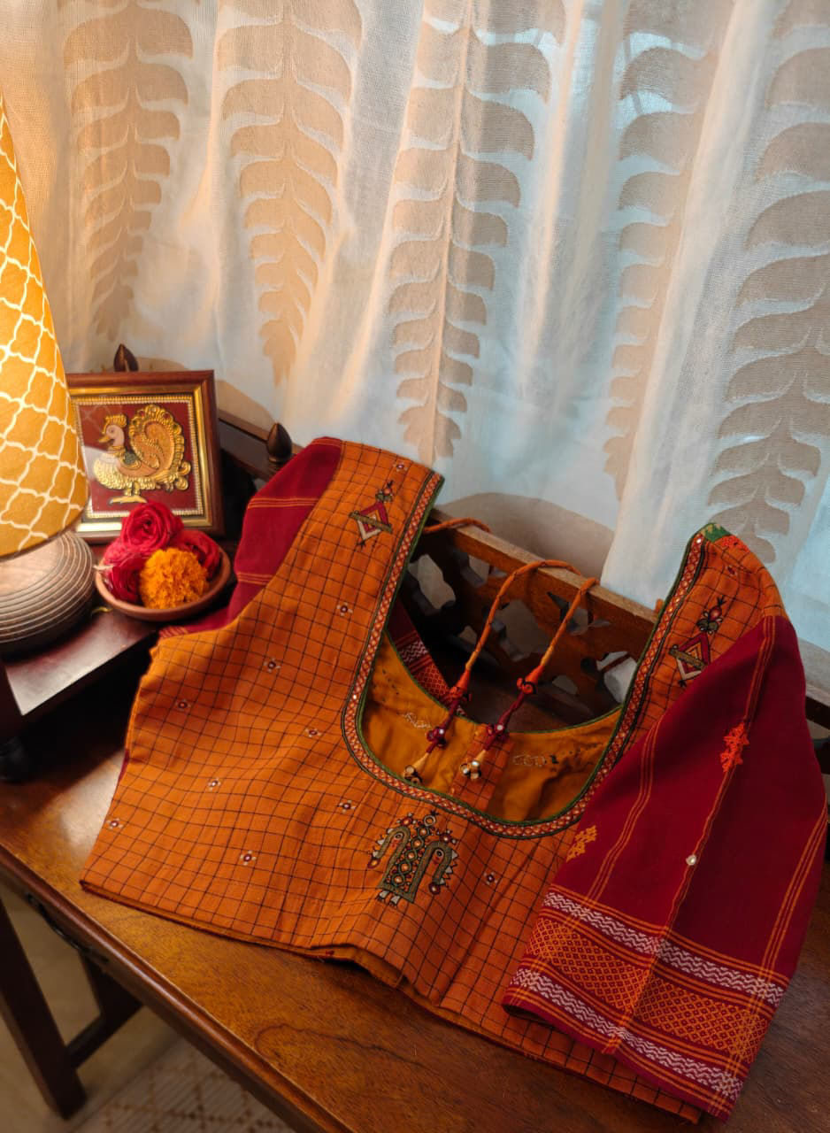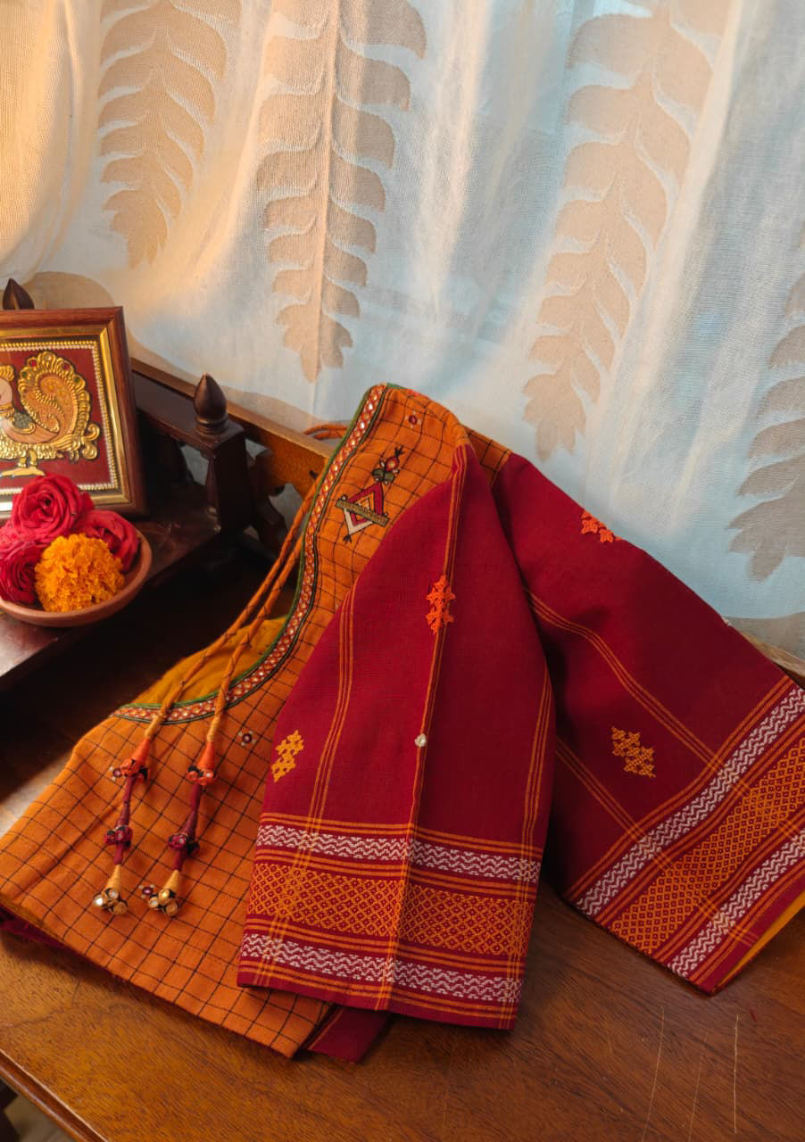 Classic Kandangi checks in warm mustard and deep red, brought alive with bold tribal embroidery. Rooted in tradition, rich in colour, and crafted in handloom cotton — a piece that carries heritage with quiet confidence. A soulful Svasa original.