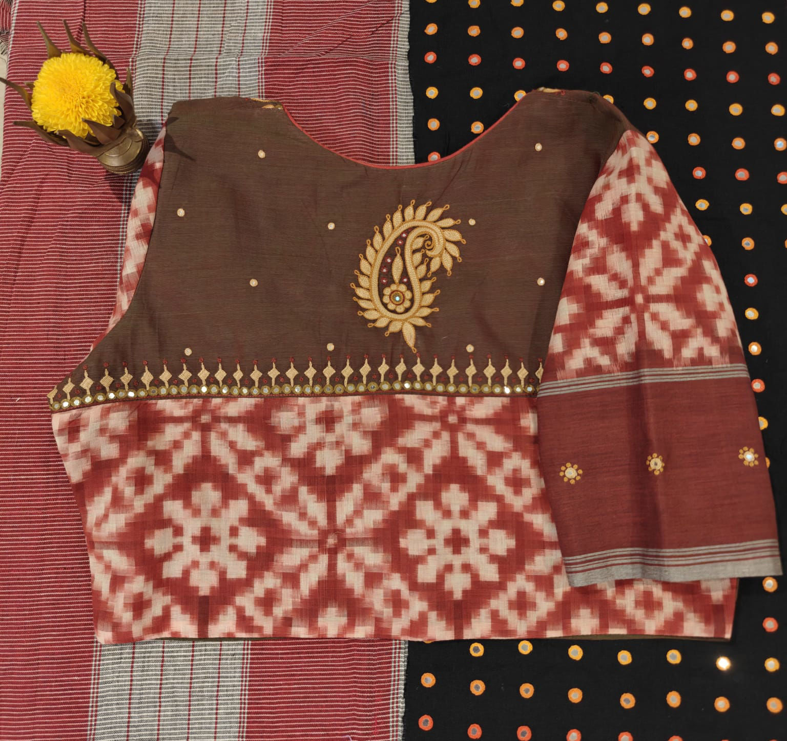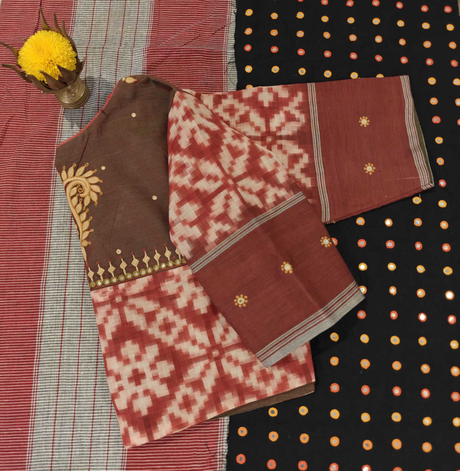 Naturally dyed in muted madder and moss green — this eco-friendly ikkat is gentle on the skin and kind to the planet. Finished with a subtle paisley, delicately embroidered by hand. Sustainable, soulful, and uniquely Svasa.
