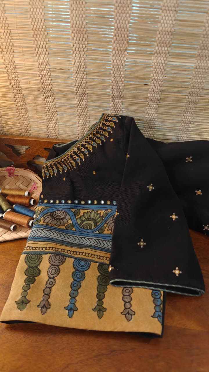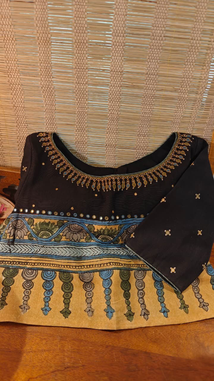 Kalamkari in soulful ochre and blue, fused with charcoal linen — a striking mix of art and texture. Finished with an intricate embroidered border around the neck, this cotton blouse is crafted to stand out quietly, yet beautifully. Svasa exclusive. Handmade in limited pieces.
