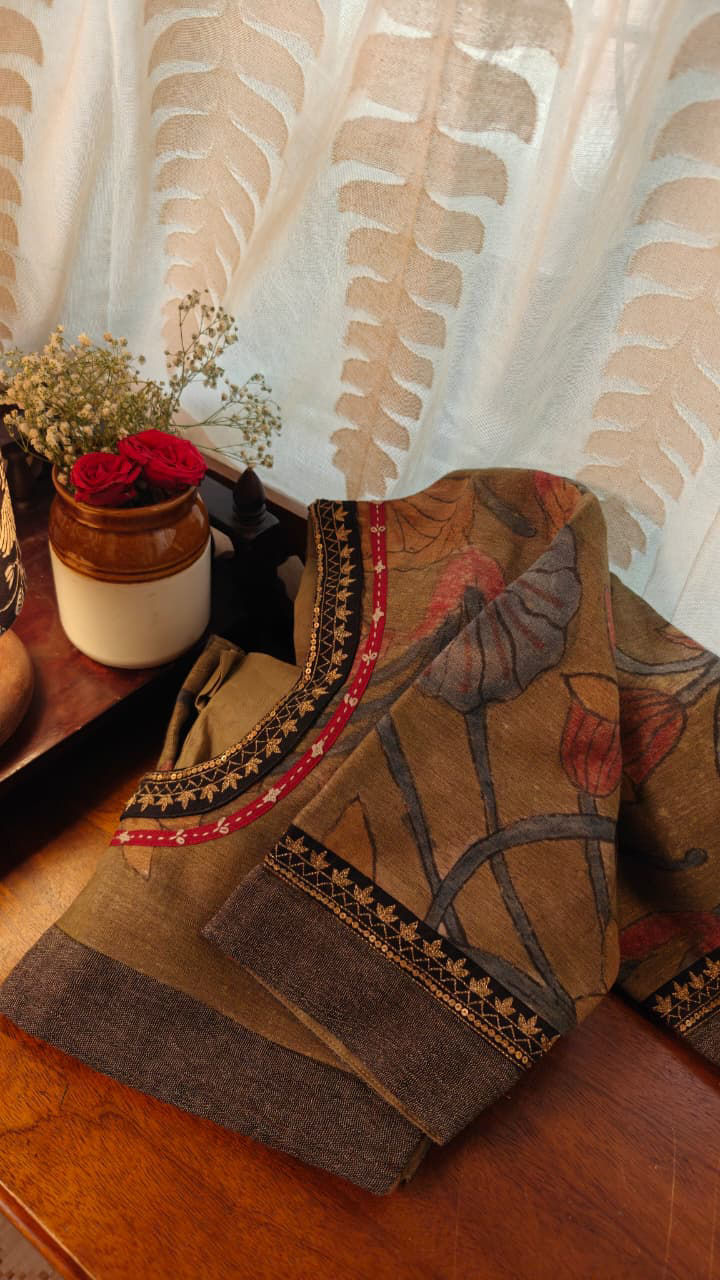 Our artisans creatively hand embroider, hand paint and hand print the blouses that come to you from the design house of SVASA. We use hand woven fabric extensively. You may notice very minute, almost insignificant flaws in the crafts since they are all handmade. We urge our patrons to overlook a few human errors that may have occurred in the process. Our aspirations are towards an empowered society, focusing on keeping traditional needlecraft alive for a long time to come.