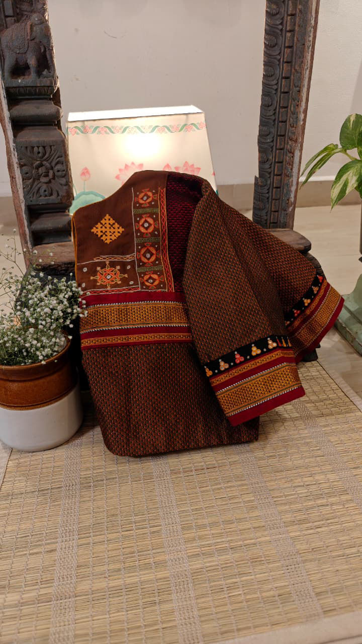 A Khun silk‑cotton in warm ochre with a fusion of colours, brought together by tribal embroidery in grounded tones. Crafted slowly by hand, shaped by tradition, and always unmistakably Svasa.