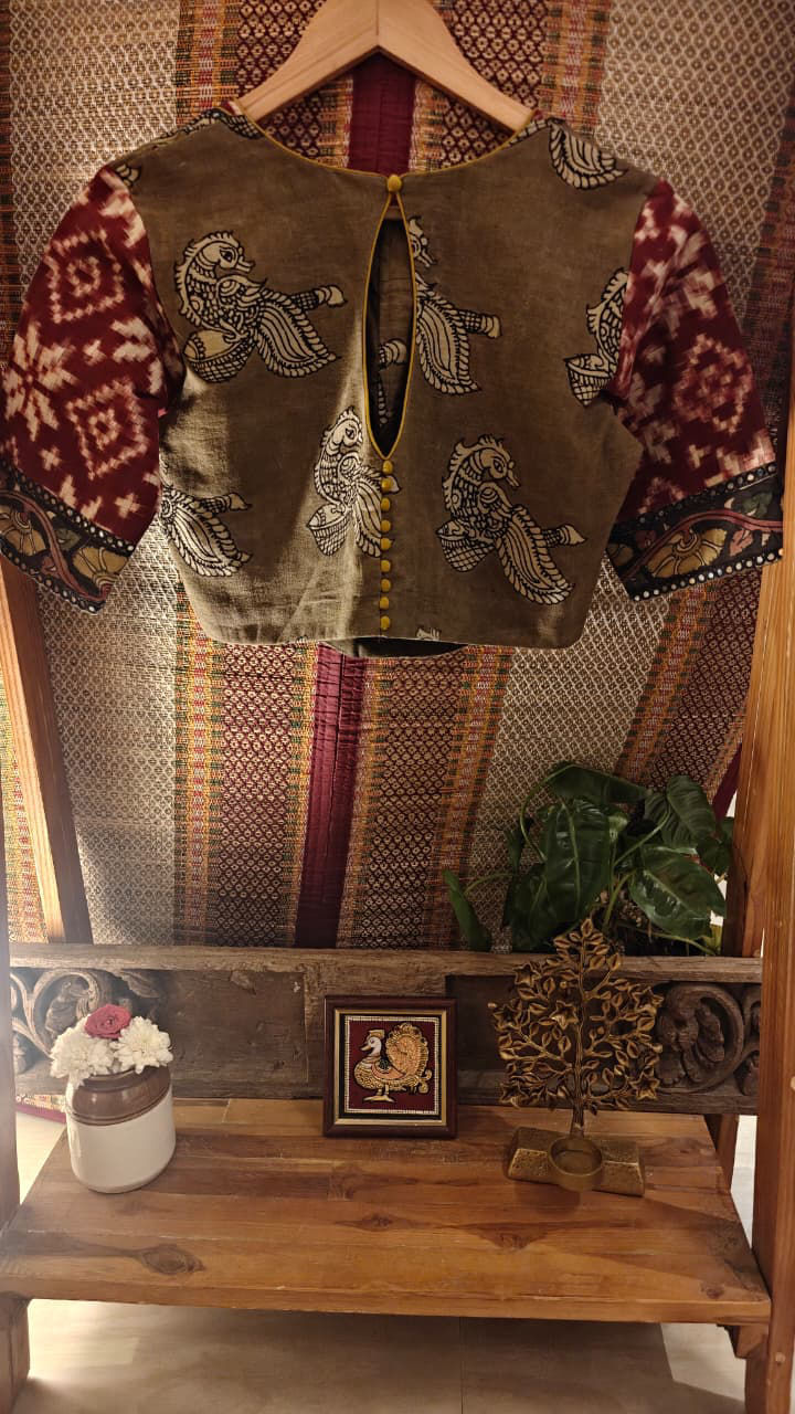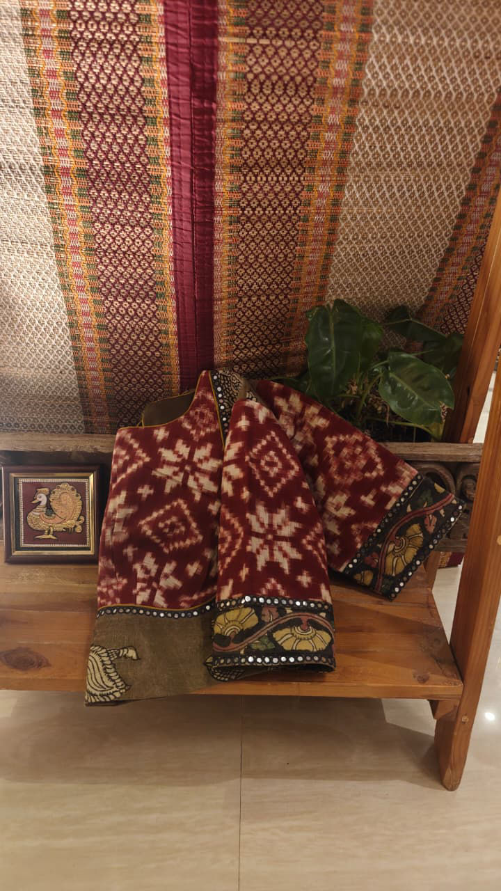 A quiet blend of stories and craft… Subtle kalamkari in olive, brought alive with ivory annam motifs that move gently across the weave. Paired with an ikkat base in natural dyes, where every tone feels grounded and real. Studded with mirrors that catch just enough light—never loud, always intentional.