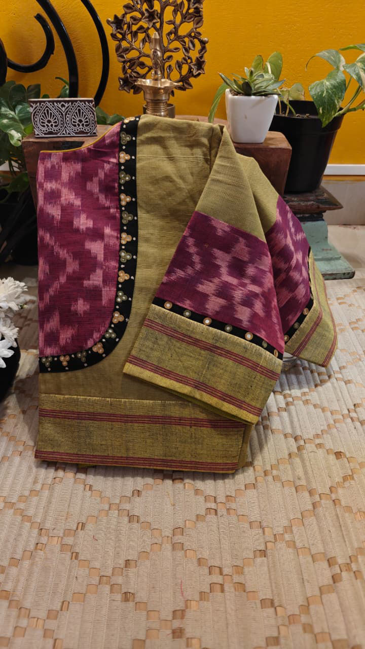 A quiet play of heritage and detail… Telia Rumal in a gentle olive, framed with finely embroidered borders in pink that add depth without taking away from its character. Handcrafted with care, where every thread settles into place with intent— subtle, rooted, and beautifully held together ✨