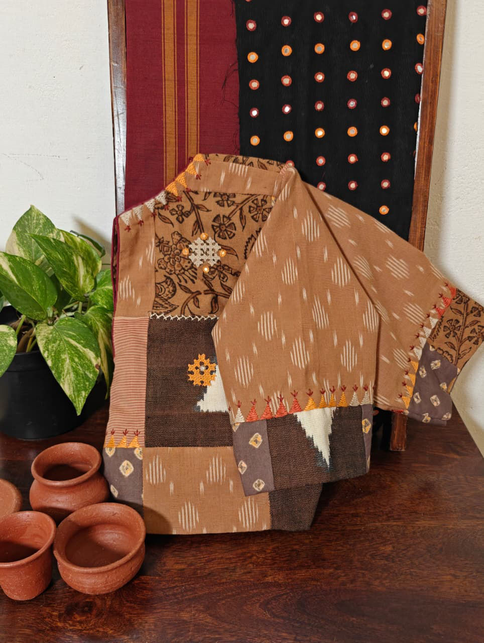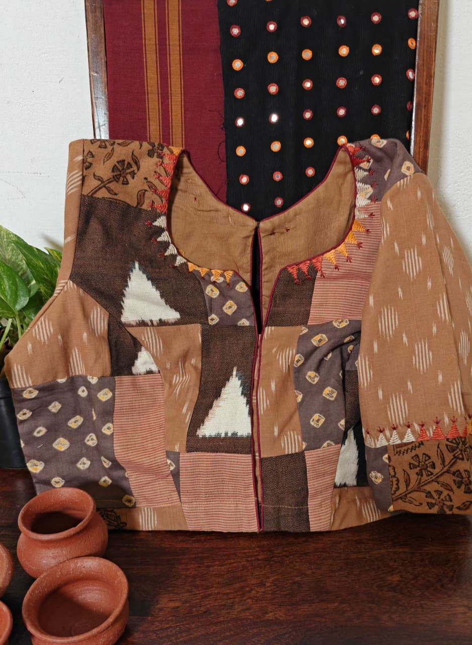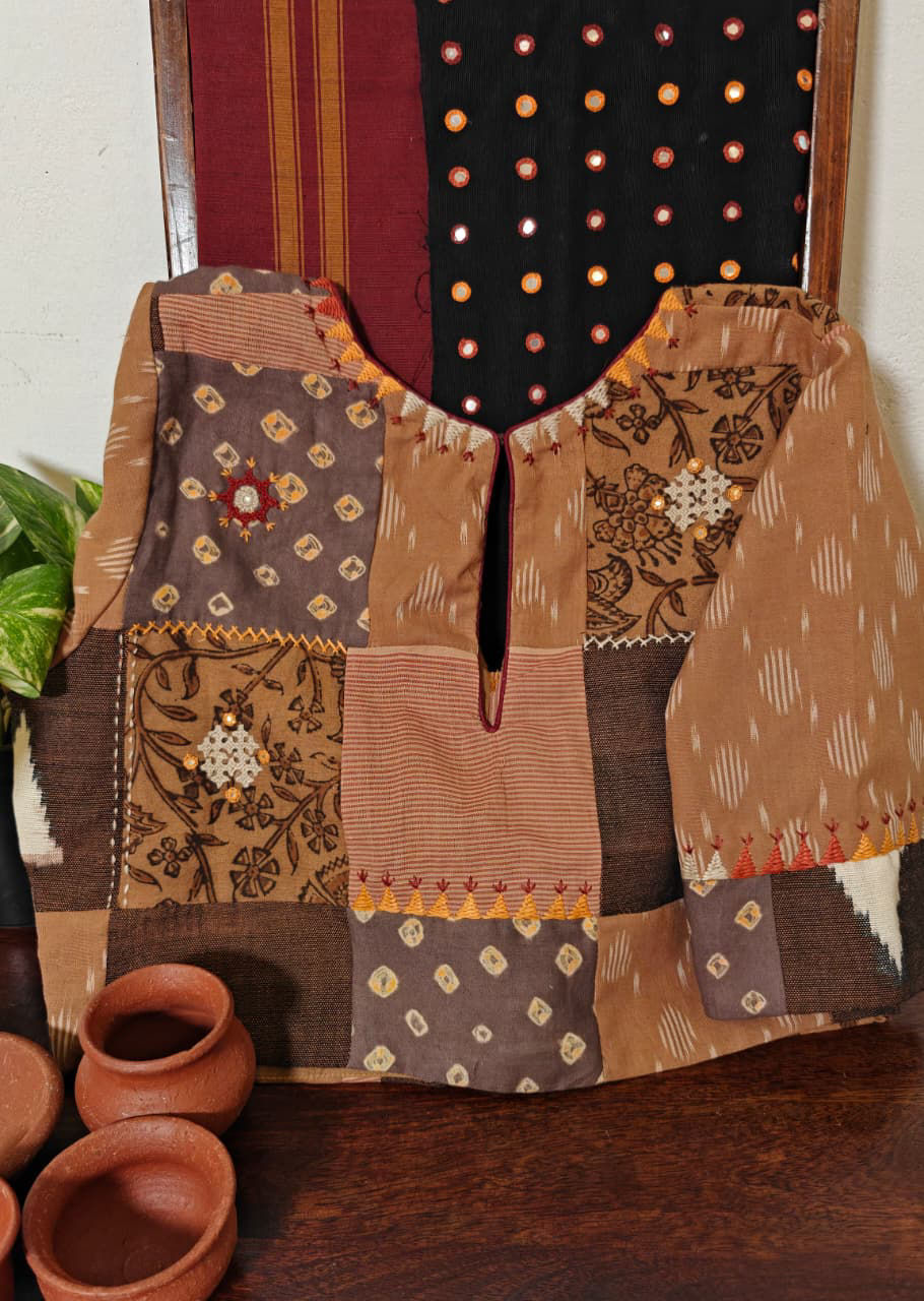 Patches fused together in earthy shades of brown, detailed with abstract embroidery that makes every stitch unique. A blouse that’s truly one of a kind. 🌸
