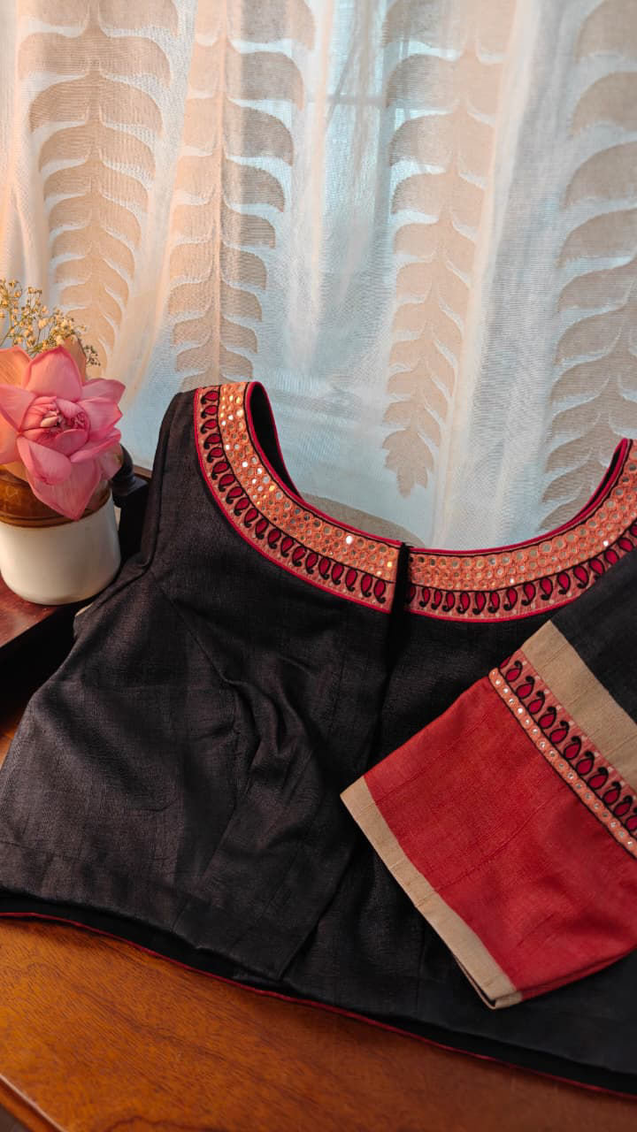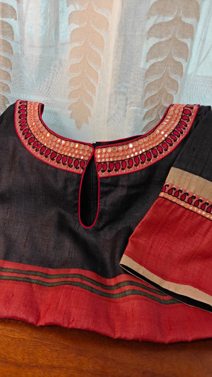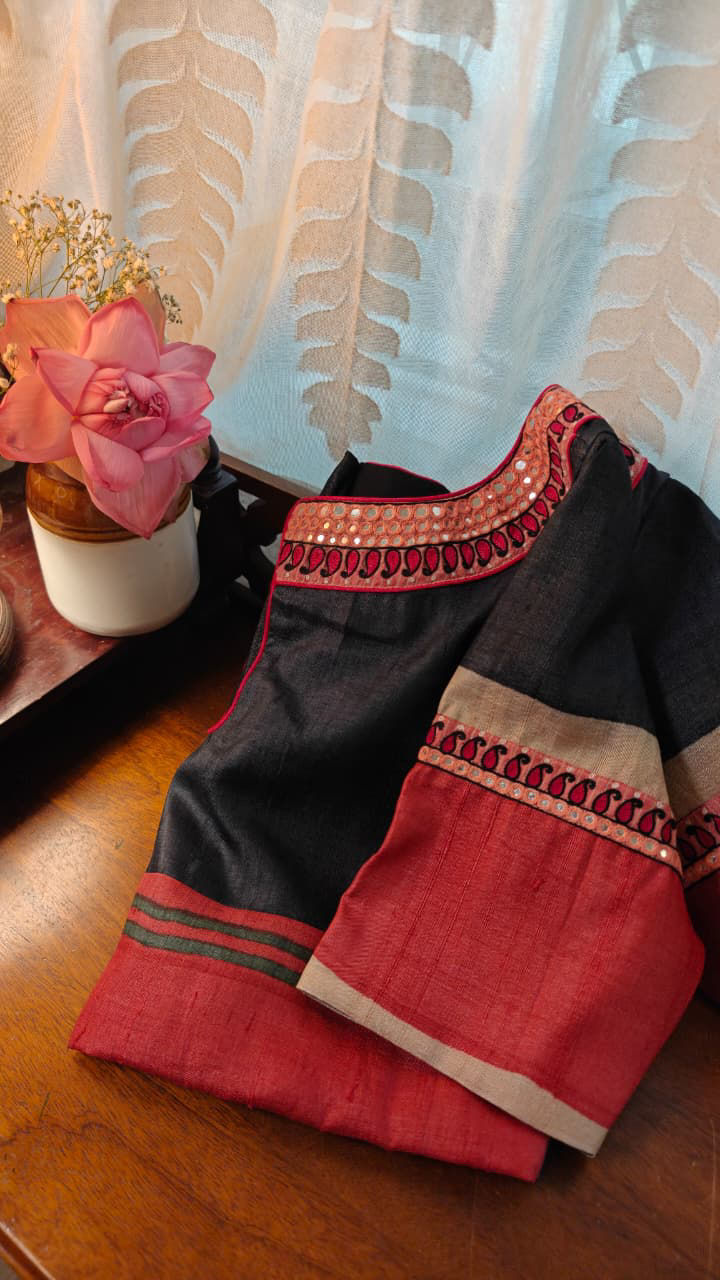 Paisleys embroidered in quiet rhythm, framed with rows of mirrors that catch the light gently. Set on a solid tussar in deep charcoal and red, softened with ivory highlights. Pure silk tussar — bold, balanced, and unmistakably Svasa.