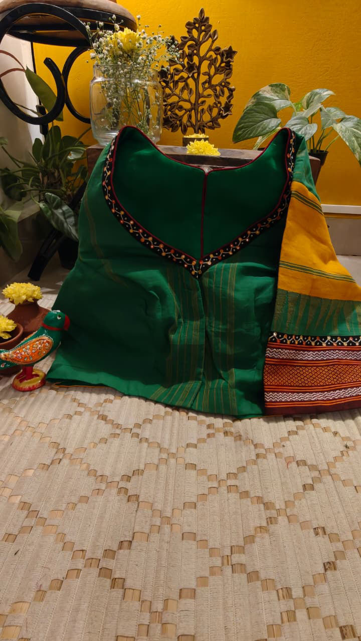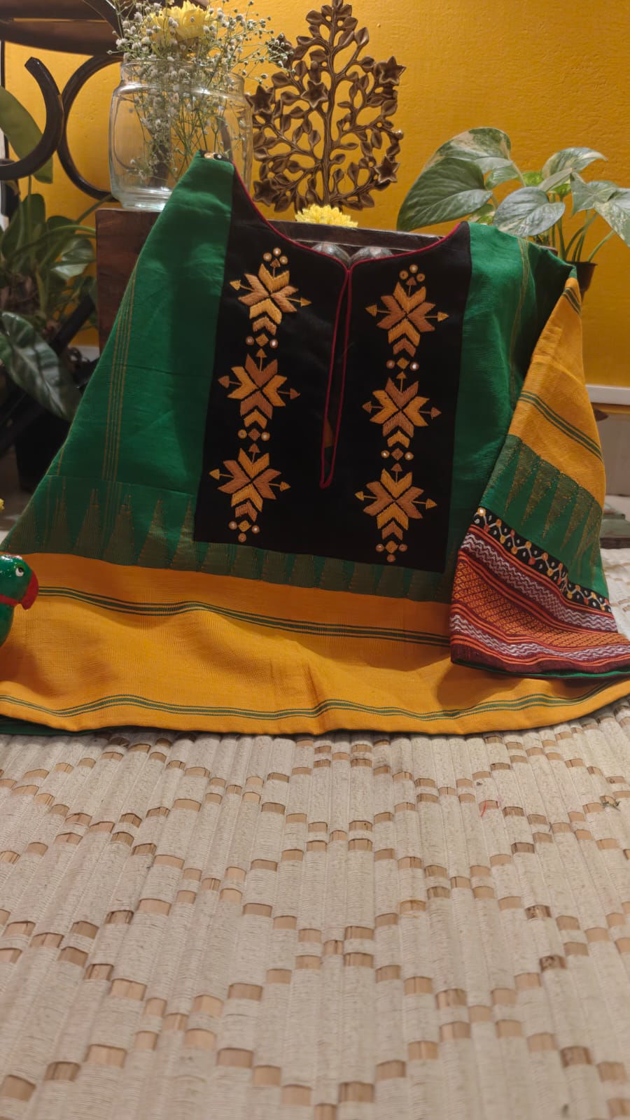 A vibrant parrot green Kanchi cotton, alive with energy and tradition. The turmeric yellow border frames it beautifully — bold, festive, and unmistakably rooted. Charcoal and turmeric embroidery trace intricate motifs across the fabric, creating striking contrast against the green base. The addition of colourful mirror borders brings a playful glint — tiny reflections that catch the light and add movement to every step.
