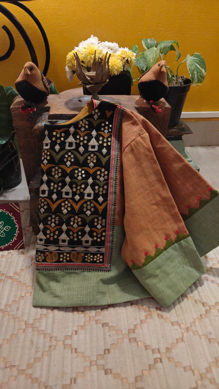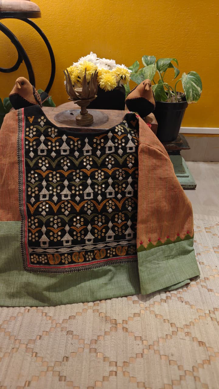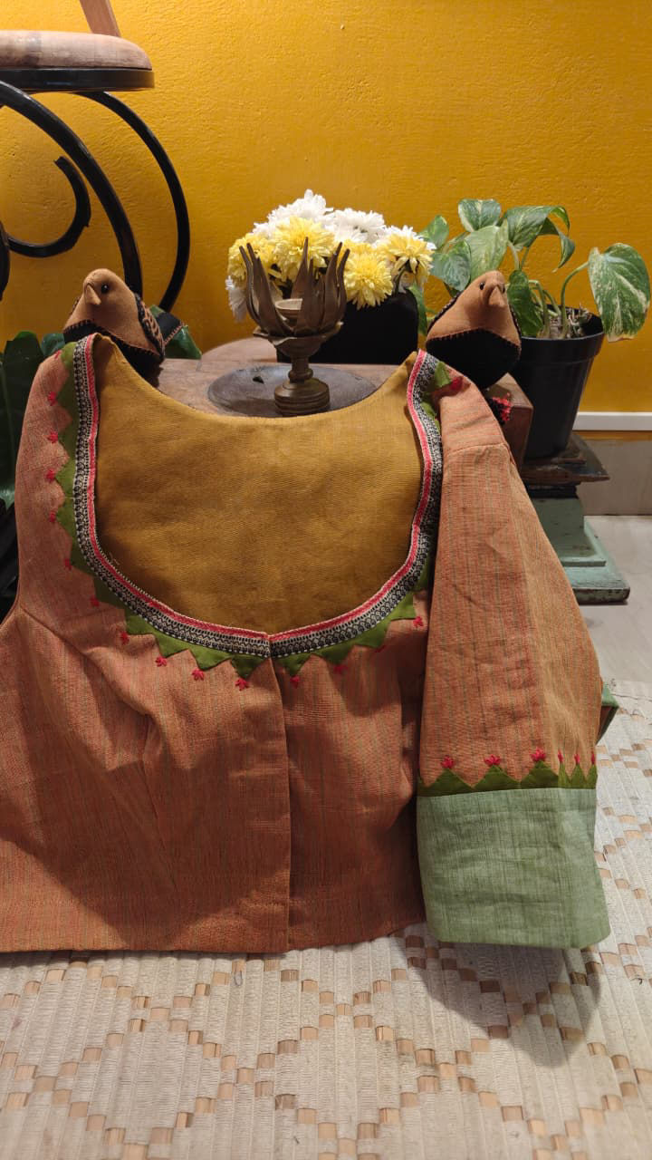 Our artisans creatively hand embroider, hand paint and hand print the blouses that come to you from the design house of SVASA. We use hand woven fabric extensively. You may notice very minute, almost insignificant flaws in the crafts since they are all handmade. We urge our patrons to overlook a few human errors that may have occurred in the process. Our aspirations are towards an empowered society, focusing on keeping traditional needlecraft alive for a long time to come.