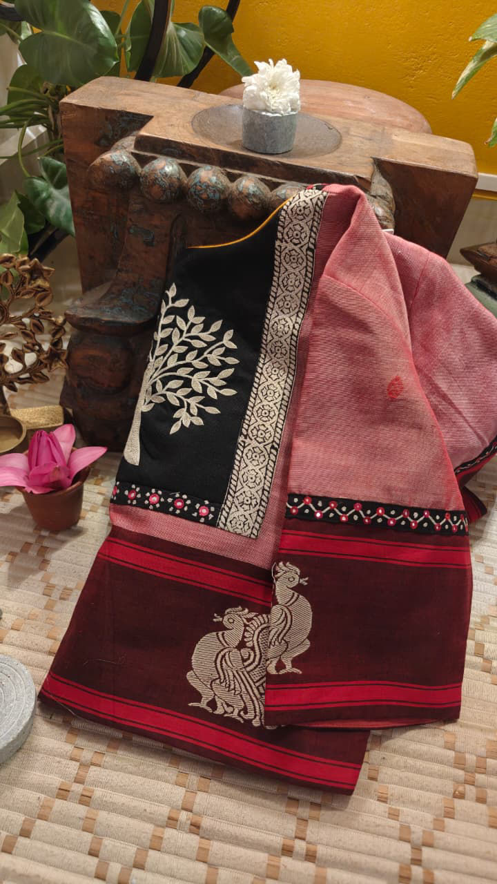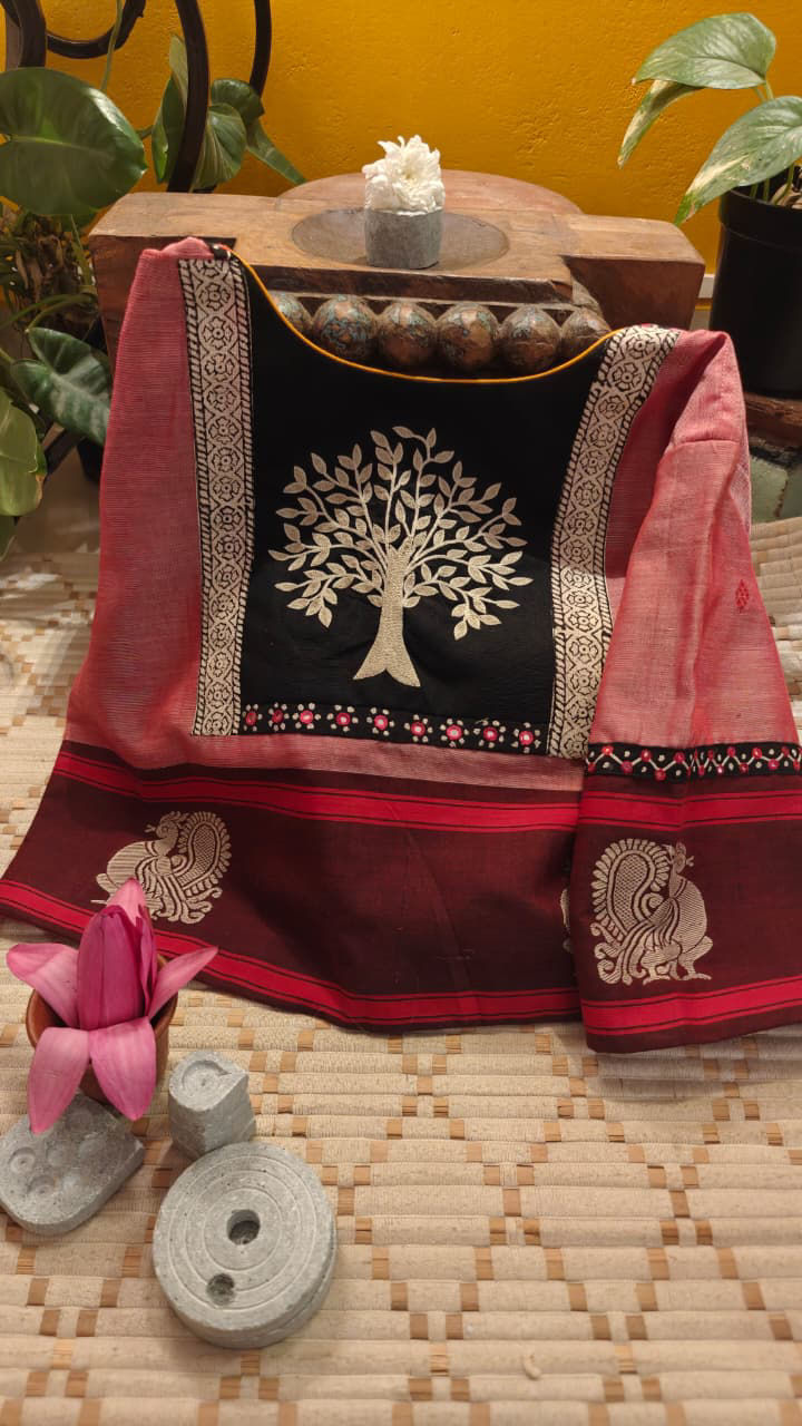 A gentle peach canvas comes alive with graceful Annams and a Tree of Life, all embroidered in soft ivory. The motifs flow like a quiet story β€” rooted, balanced, and timeless.