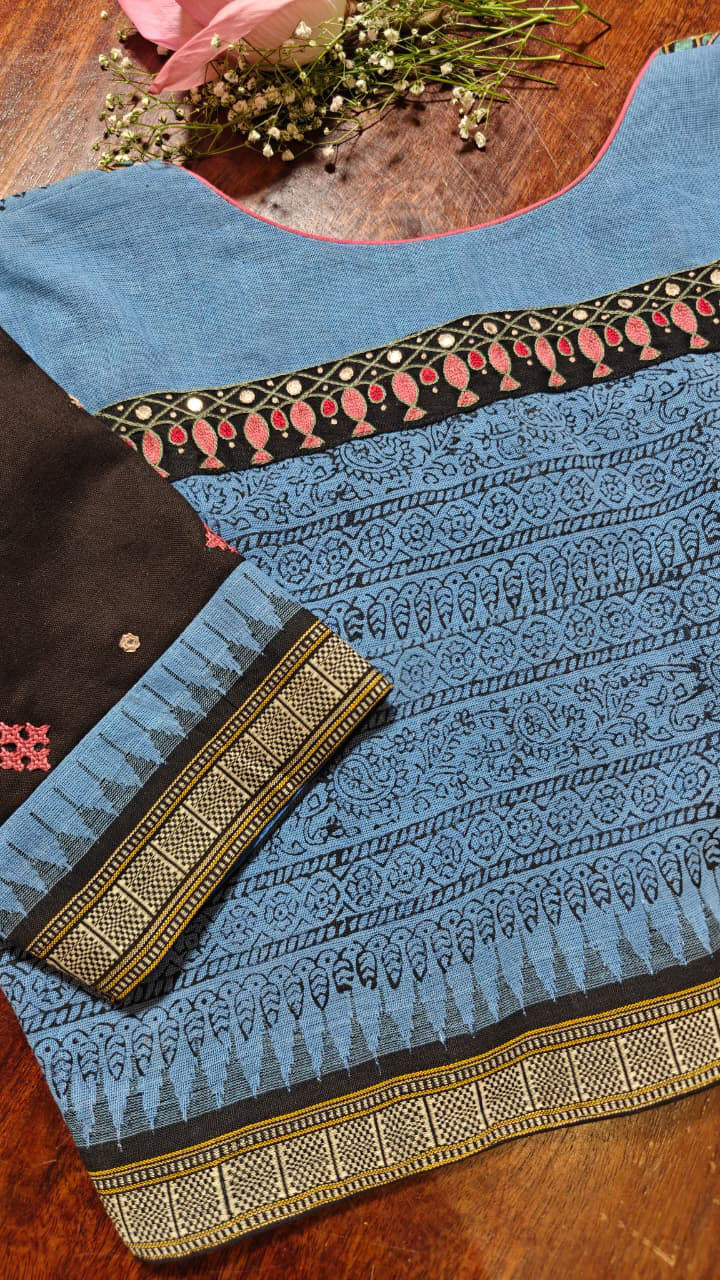 Pure Ponduru khadi in a deep, beautiful blue — brought alive with unusual embroidery and block printed details that make it feel quietly bold. A cotton classic with a craft-forward soul… effortless, original, and unmistakably Svasa. 💙✨