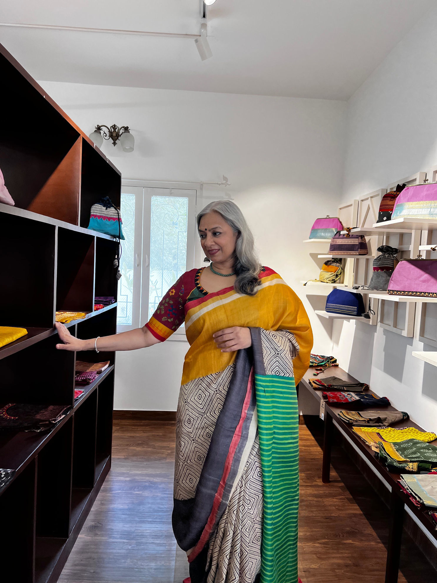A beautiful interplay of colours, block printed on rich tussar—each shade settling into the weave with quiet depth and character. A piece that feels both vibrant and rooted, carrying the charm of handcrafted detail in every inch. Please note: Ready blouse is not included in the saree price.