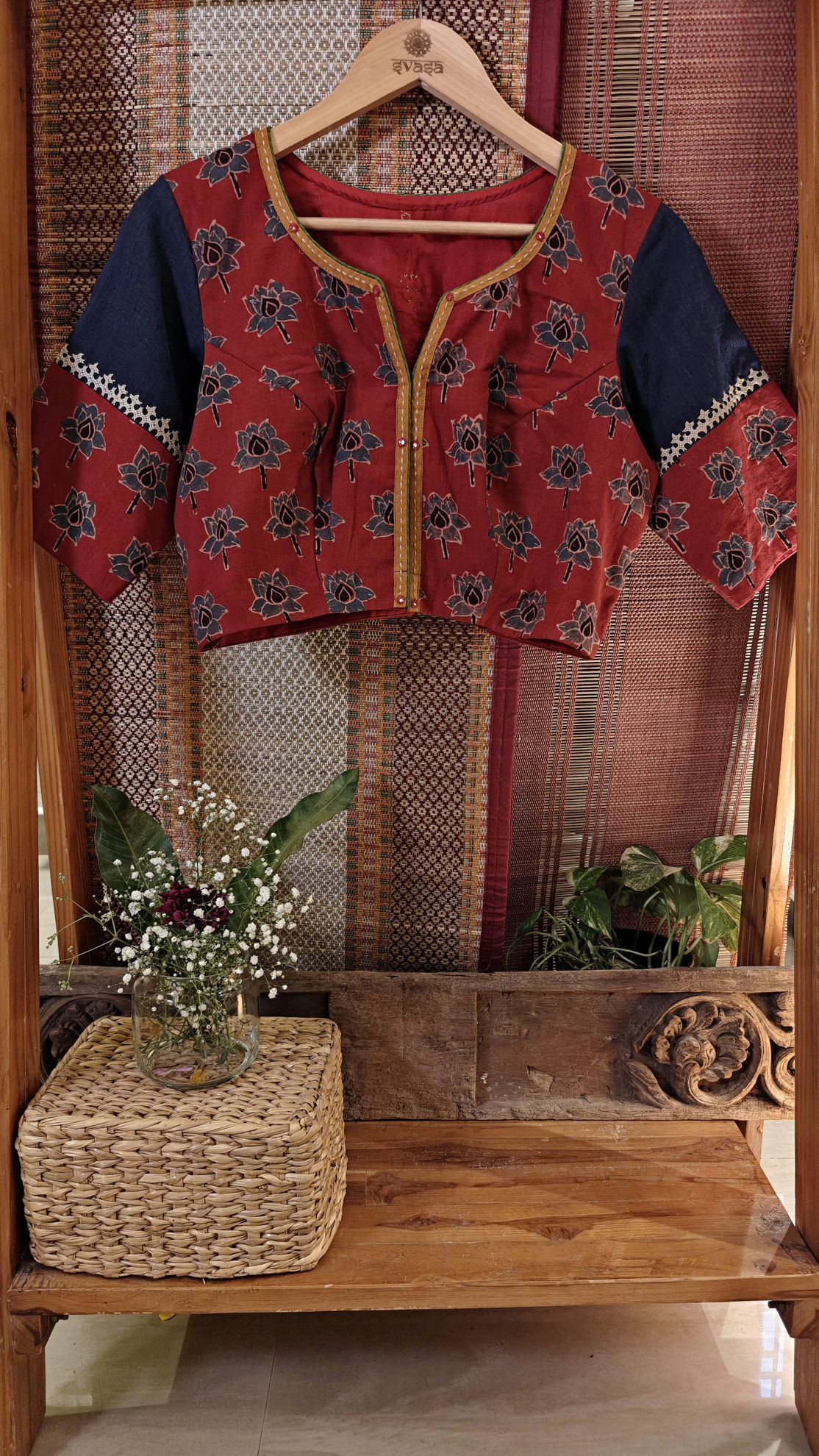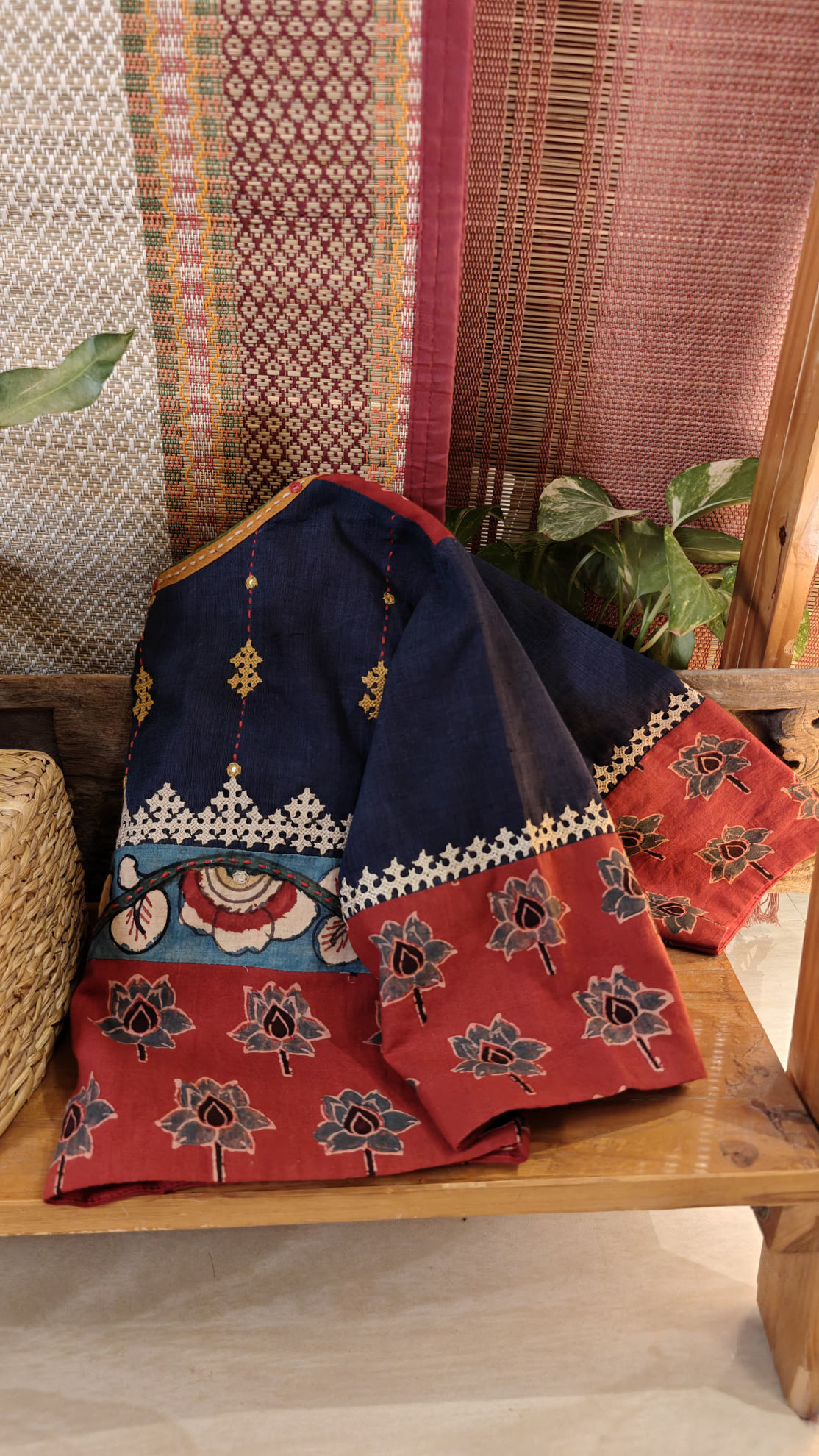 A striking red Ajrakh base brought alive with floral indigo prints — rooted, rhythmic, and timeless. Finished with detailed Kutchi embroidery, adding texture, colour, and quiet strength to the piece. Crafted in cotton, it carries comfort with character, tradition with ease. A classic that feels bold without trying too hard.