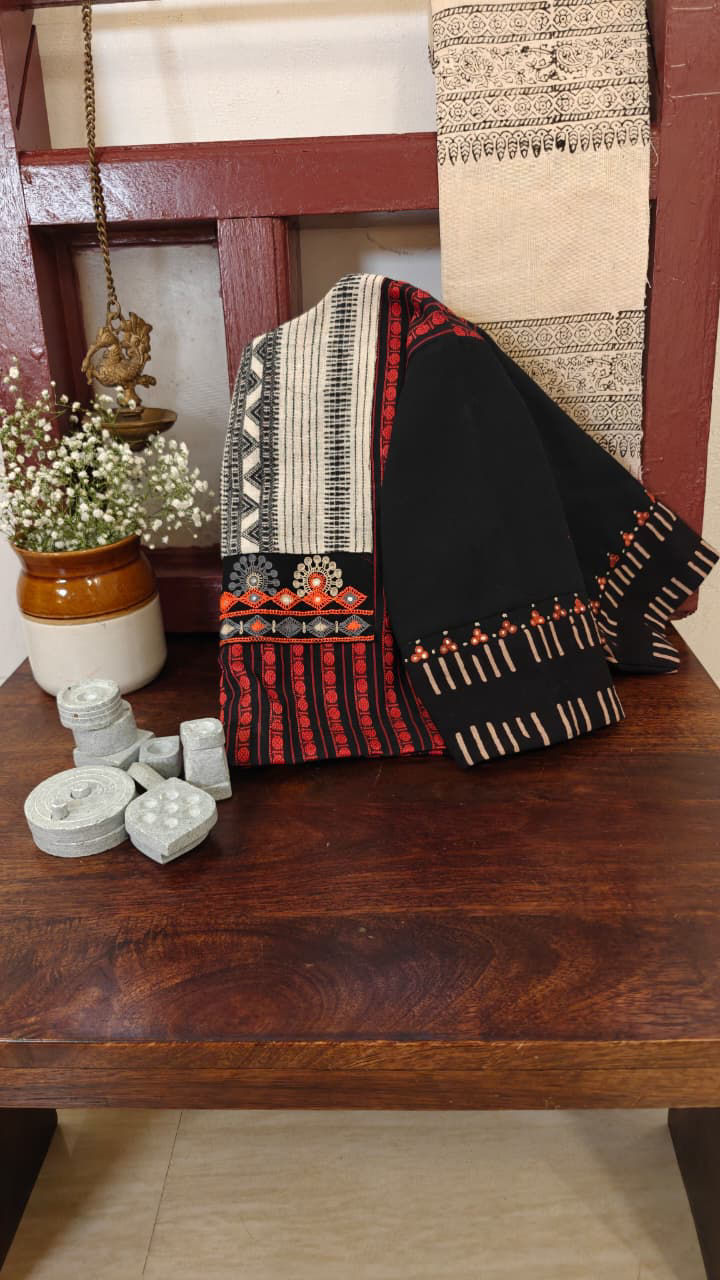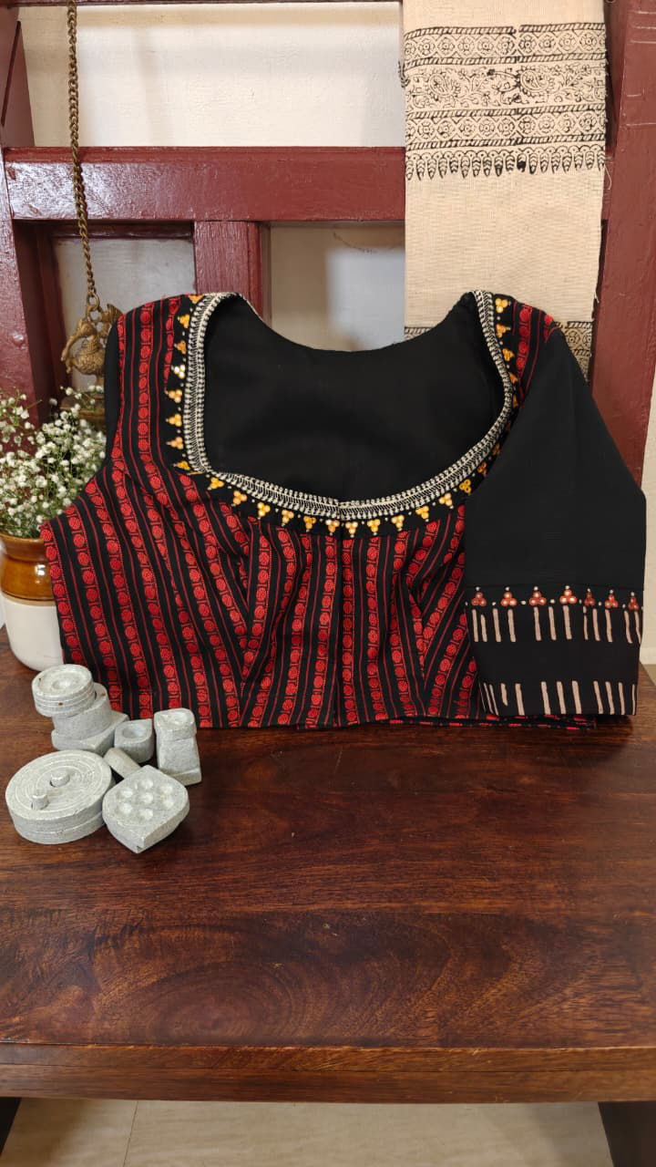 A classic red Kanchi cotton finds a striking contrast in an ivory Bhujodi yoke, brought alive with intricate tribal embroidery. The meeting of structured South Indian weave and rustic desert craft creates a blouse that feels both rooted and refreshingly distinct.
