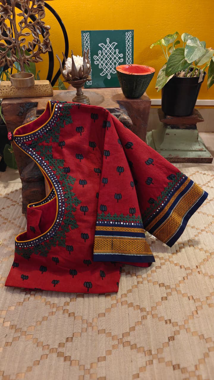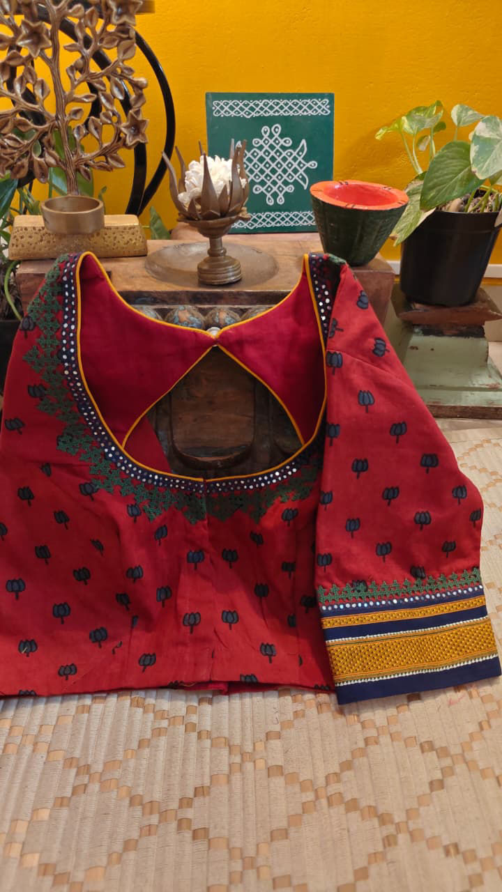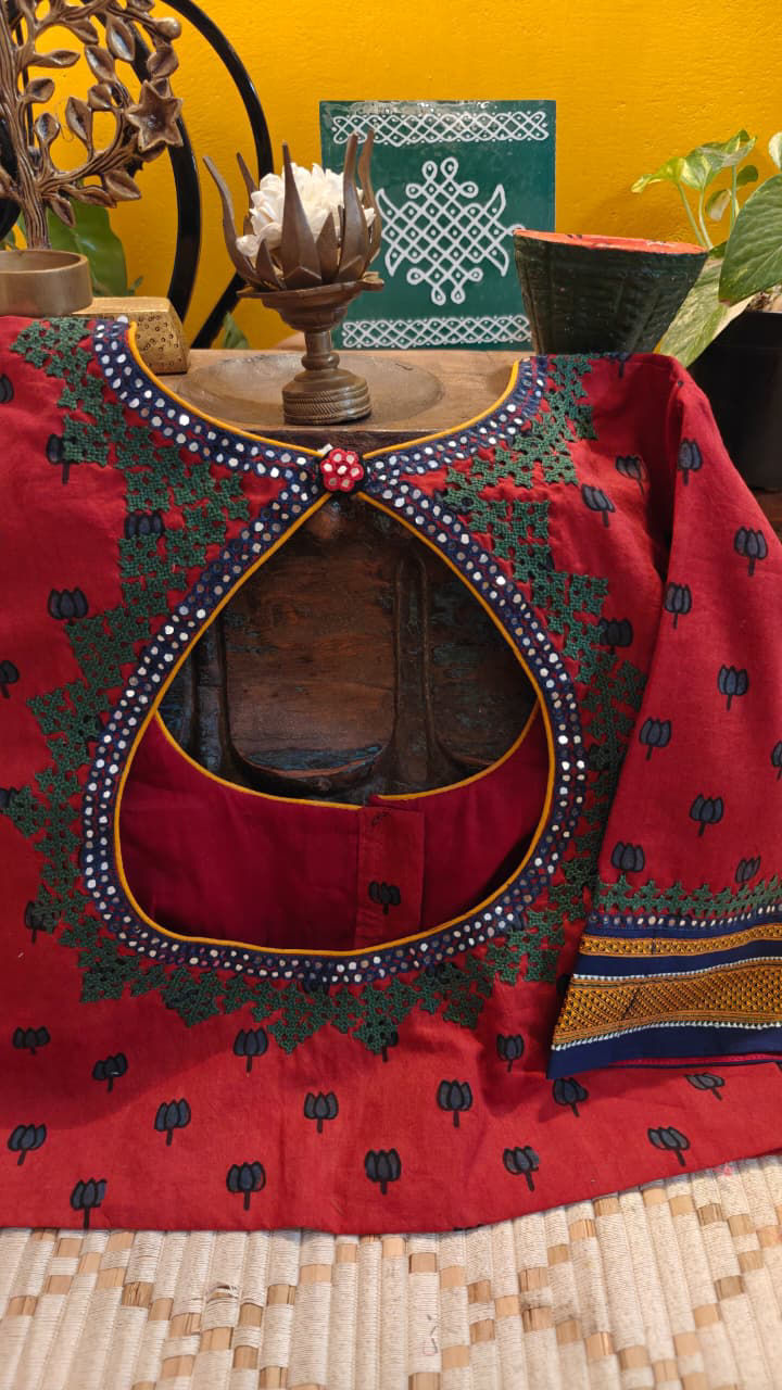 Deep red Ajrakh blocks come alive with thick Kutchi embroidery, each stitch adding texture, depth, and character. A bold meeting of print and handwork — earthy, vibrant, and rooted in craft. 🪡