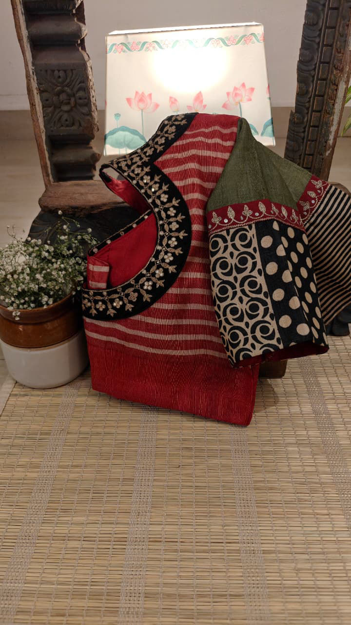 Handmade block-printed tussar silk in red stripes, paired with green and a charcoal–ivory polka border for that striking contrast. Finished with antique gold embroidery around the neck, this piece carries a rich, timeless charm — crafted the Svasa way.