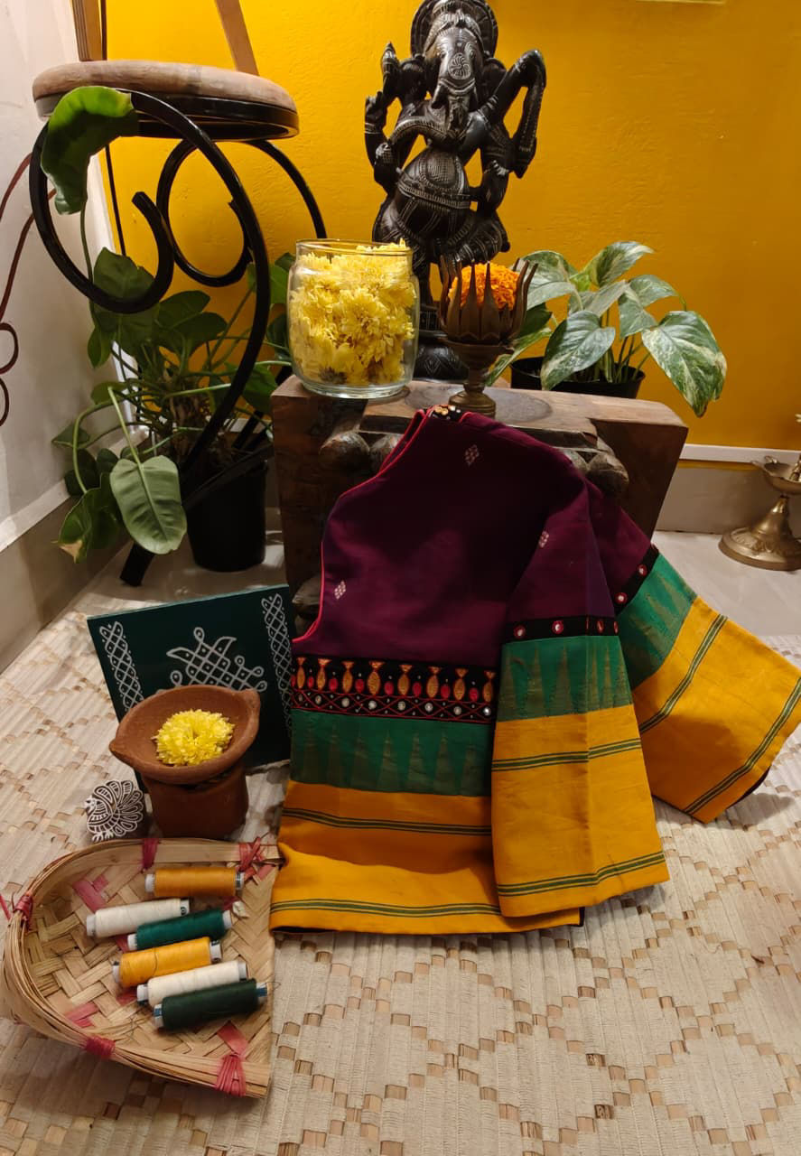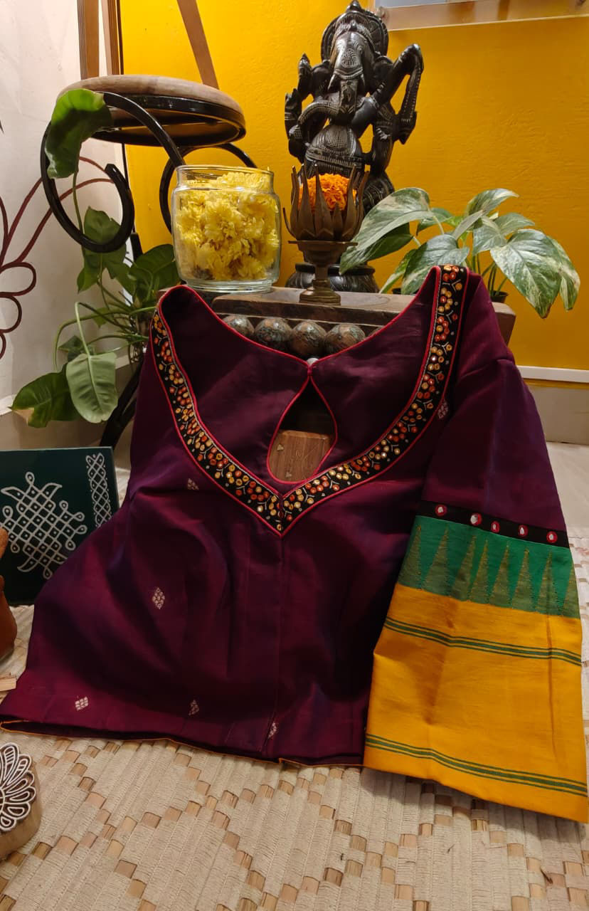 A striking blend of purple and deep burgundy in classic Kanchi cotton — rich, layered, and full of depth. Framed with bold turmeric borders that glow warmly against the jewel tones, this piece carries a quiet drama. A dash of parrot green peeks through, adding freshness and contrast — unexpected yet beautifully balanced.