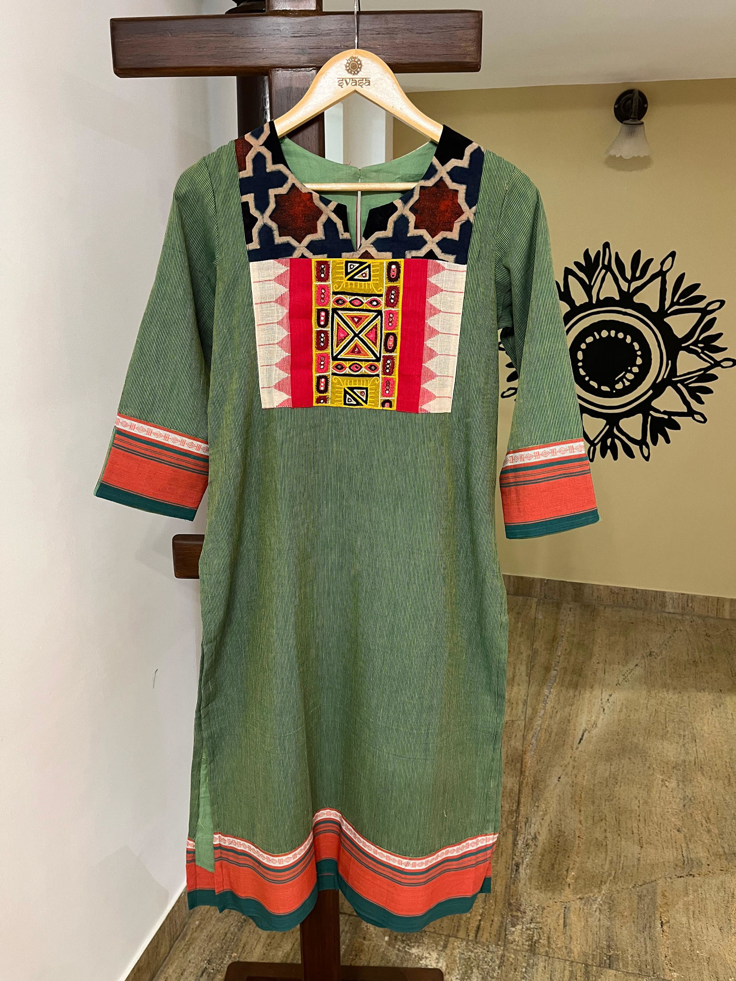 A tapestry of tradition—revival weave from Karnataka, Ponduru Khadi on the yoke, and intricate Ajrakh prints come together in a soulful fusion. Crafted with care, rooted in heritage