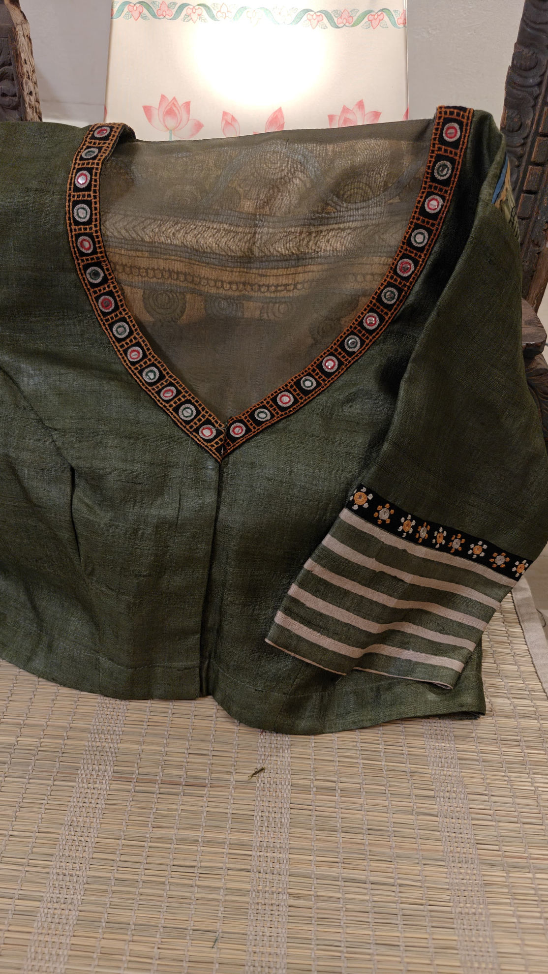 A classic sage tussar silk, soft in tone and texture. The back is kalamkari, hand-painted in earthy shades — the kind that feel lived-in and timeless. The front and sleeves carry tribal embroidered borders, stitched in rhythm, thread by thread. Each piece is hand blocked, each detail placed with intention. A blouse that holds craft, memory, and quiet beauty.