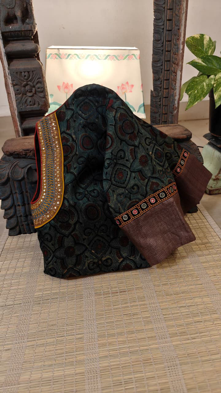 A soft Chanderi silk, woven in tradition and finished in antique embroidered shades… Every stitch whispers stories from another time — quiet, timeless, and crafted with the beauty of the past. A true Svasa classic.