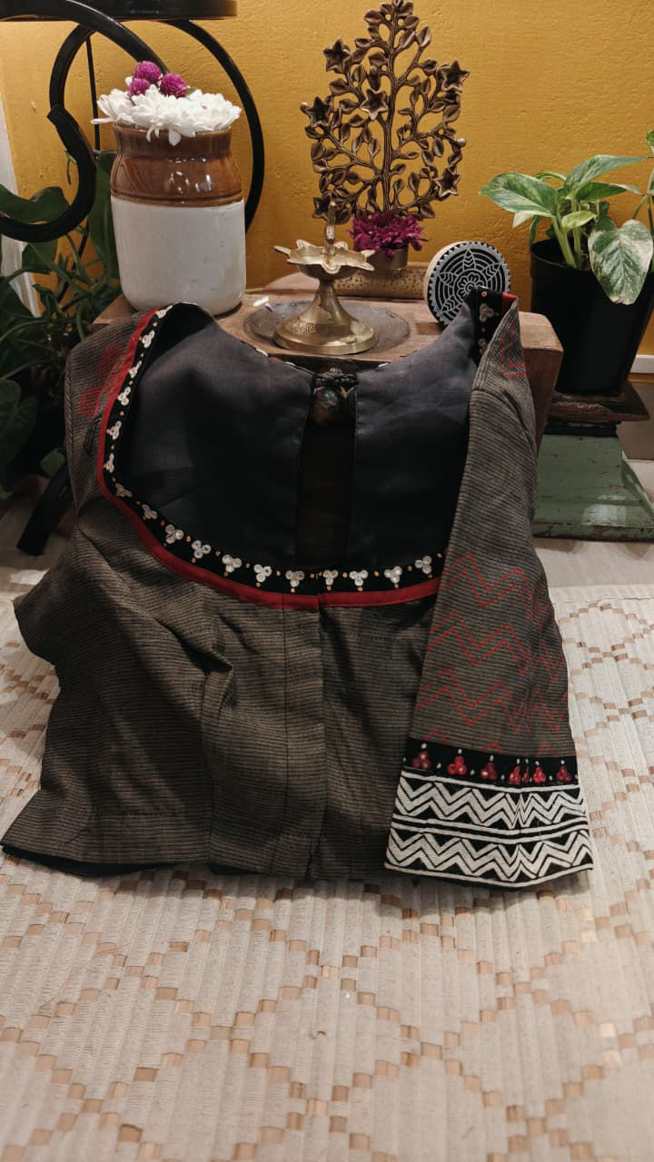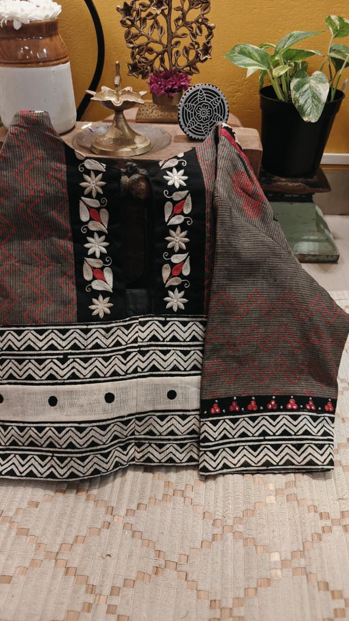 Earthy block prints unfold across smokey brown cotton, creating a canvas rich in understated charm. Delicate ivory embroidery traces the surface with quiet elegance, adding contrast and refinement to the rustic base. Rooted in simplicity yet elevated through handcrafted detail, this piece reflects a timeless balance of texture, tone, and tradition.