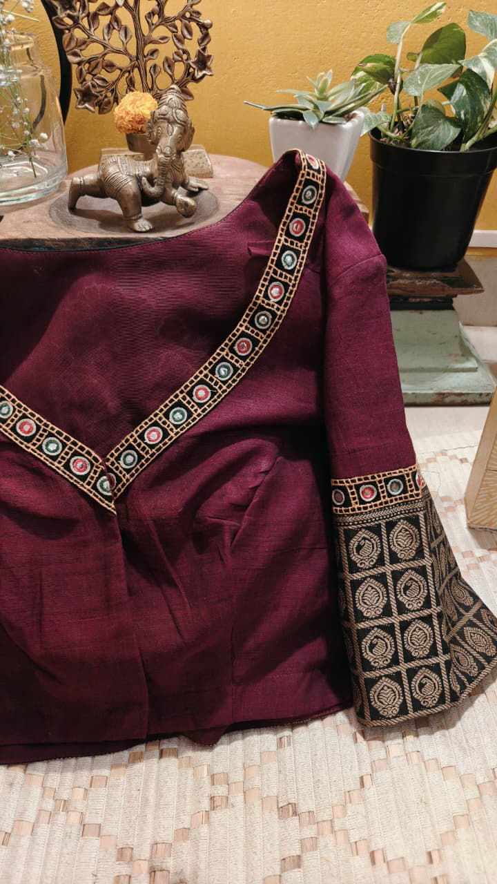 Our artisans creatively hand embroider, hand paint and hand print the blouses that come to you from the design house of SVASA. We use hand woven fabric extensively. You may notice very minute, almost insignificant flaws in the crafts since they are all handmade. We urge our patrons to overlook a few human errors that may have occurred in the process. Our aspirations are towards an empowered society, focusing on keeping traditional needlecraft alive for a long time to come.