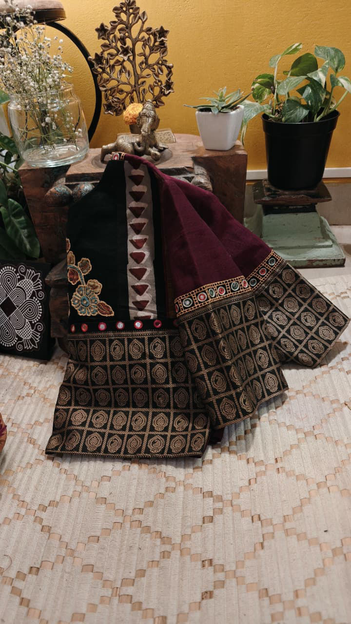 Set against a deep charcoal Kanchi cotton base, hand-crafted Kalamkari comes alive through delicate appliqué work, each motif carrying echoes of narrative and tradition.