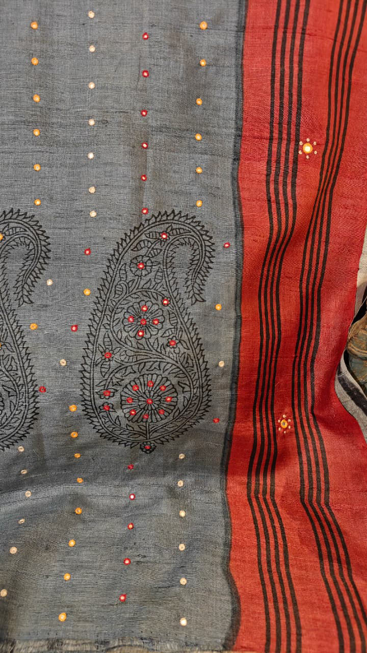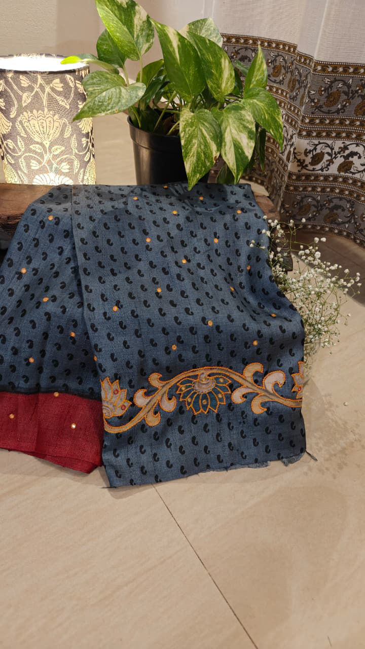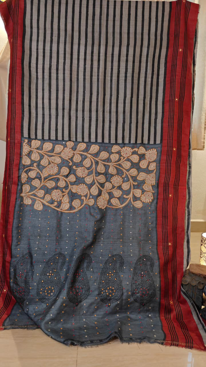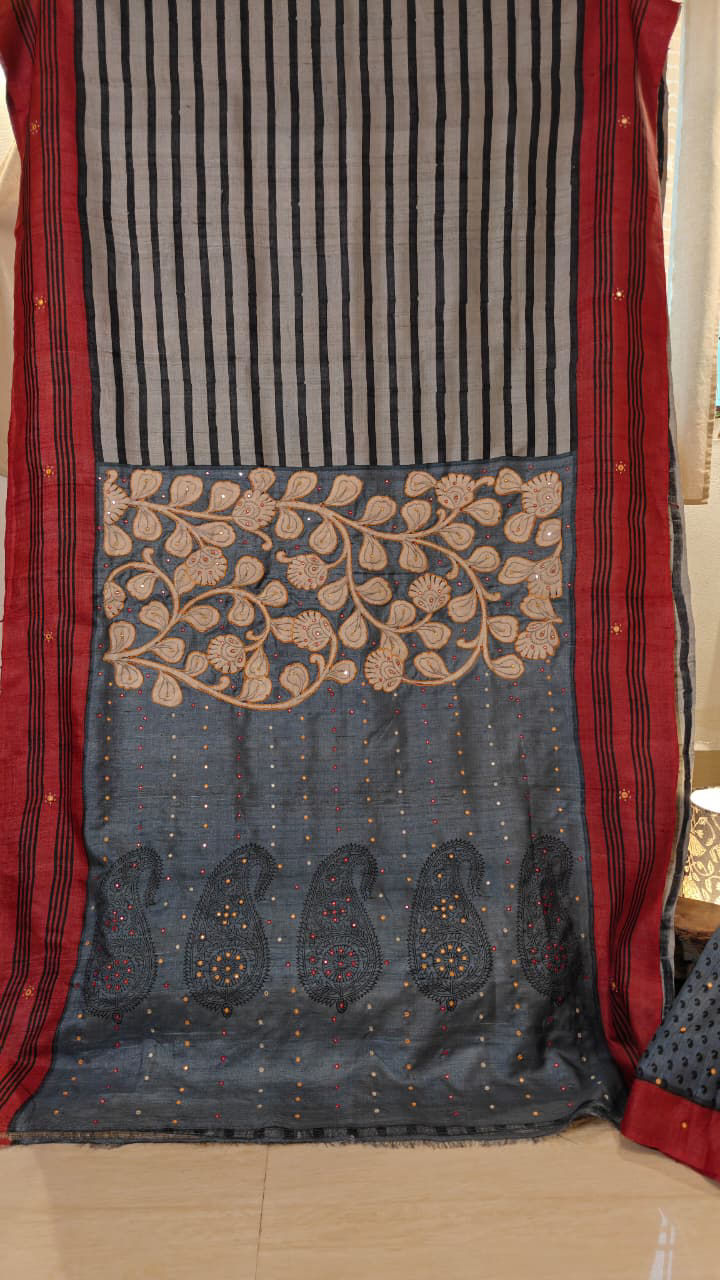 Grey and charcoal stripes brought alive with a bold red border. Hand-embroidered details meet timeless Kalamkari appliqué — a Svasa original, woven with patience and finished with love. 🌿🪡 A saree–blouse set in pure tussar silk, handmade at Svasa — where every stitch tells its own story. ✨