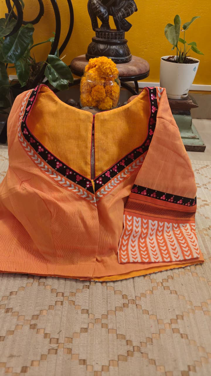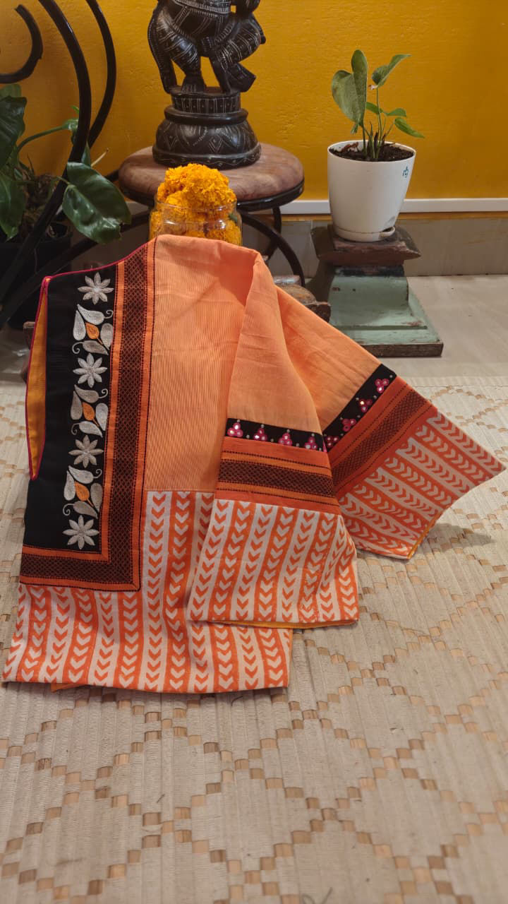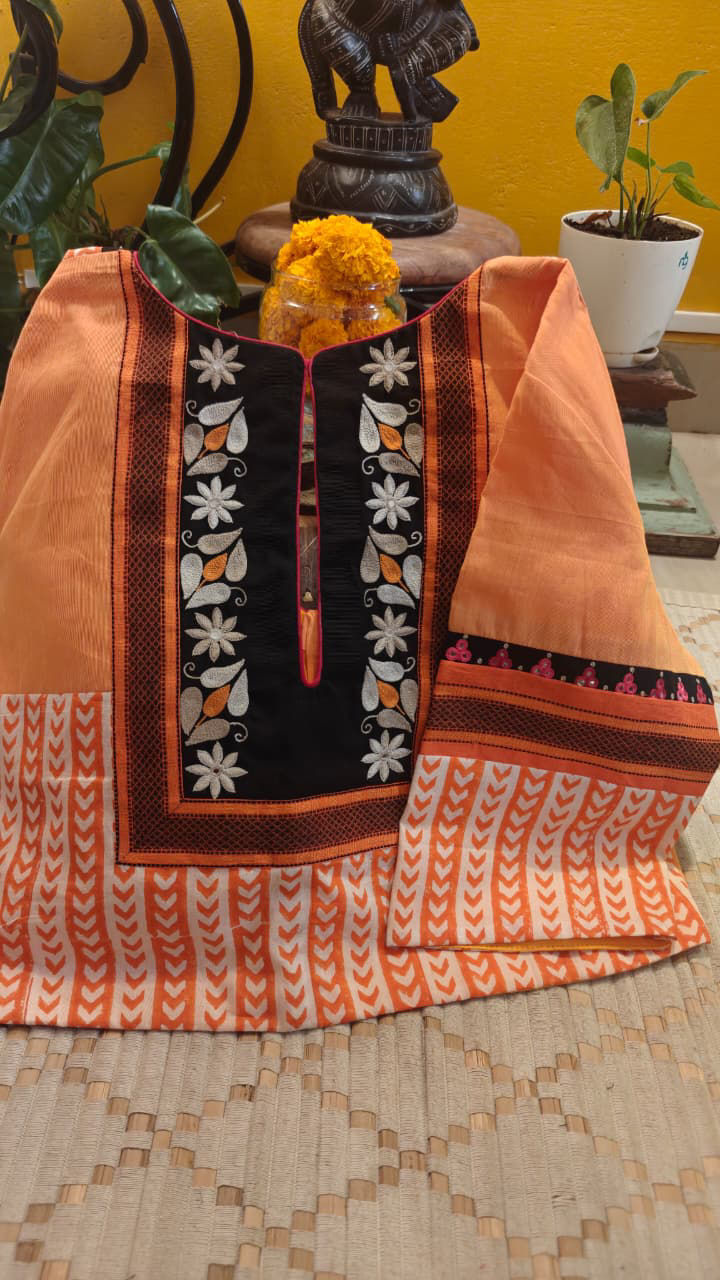 A vibrant orange canvas brought to life with tribal embroidery in ivory—bold yet beautifully grounded. Each motif carries a sense of rhythm and heritage, standing out in quiet contrast against the warmth of the base. Striking, earthy, and unmistakably handcrafted.