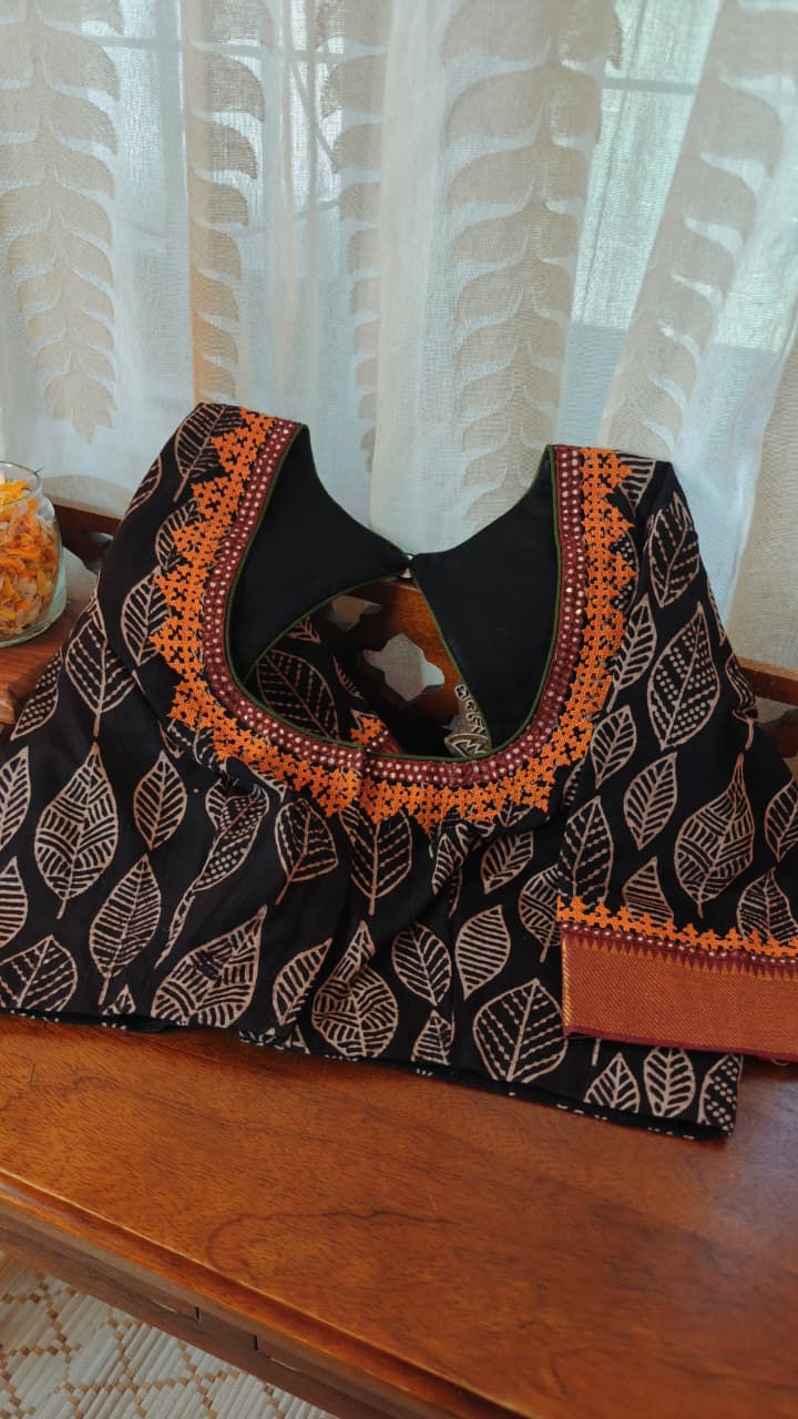 Block printed cotton brought alive with thick Kutchi embroidery in yellow, celebrating bold craft and joyful detail. The hand-embroidered button adds a thoughtful finishing touch, making the piece feel complete yet effortlessly rooted. Earthy, vibrant, and full of character, this creation carries the warmth of tradition with an easy, everyday charm — a quiet statement in handcrafted beauty.