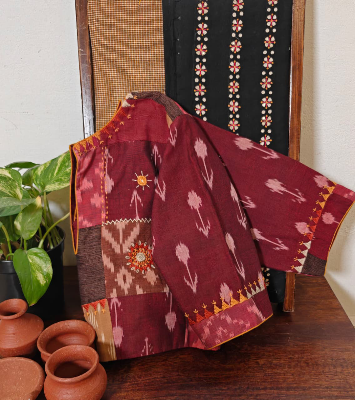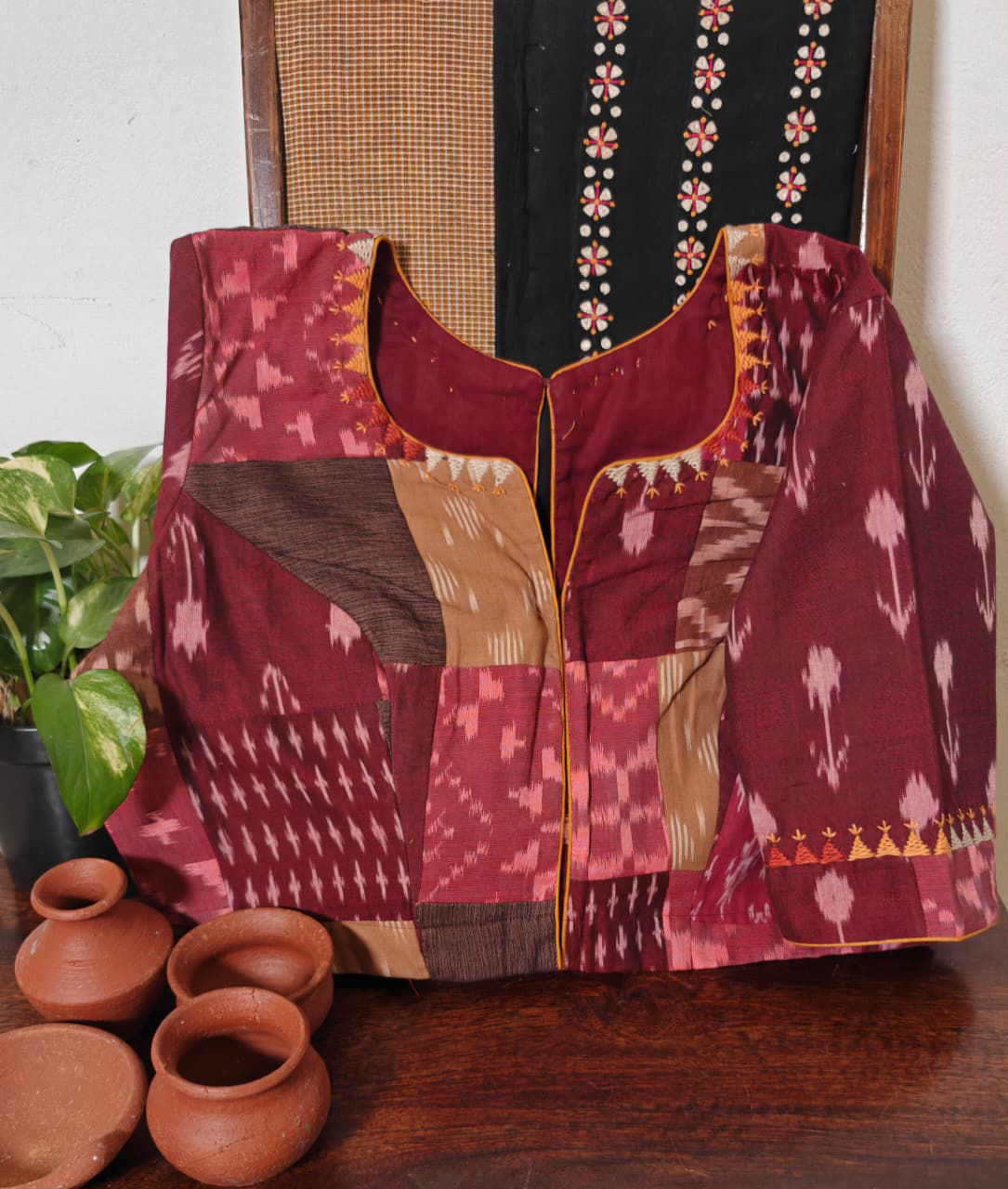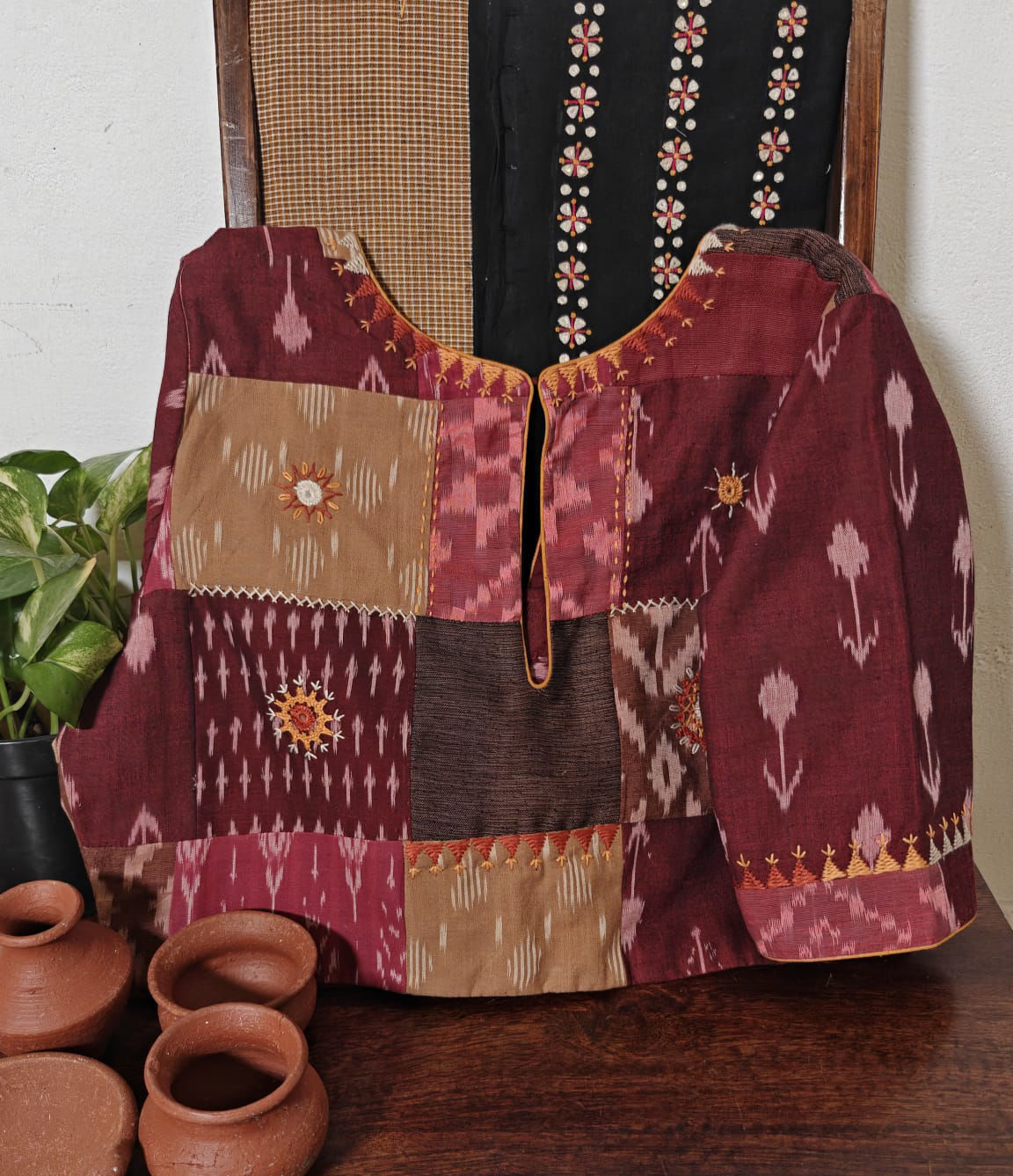 Pieces of ikkat, touched with eco dyes, fused together into one timeless creation. A blouse that speaks of recycled beauty and conscious craft — handmade at Svasa. 🪡🌿