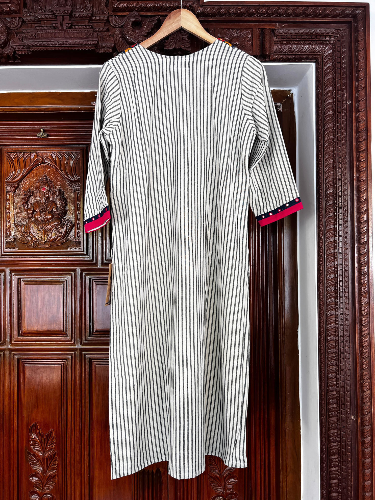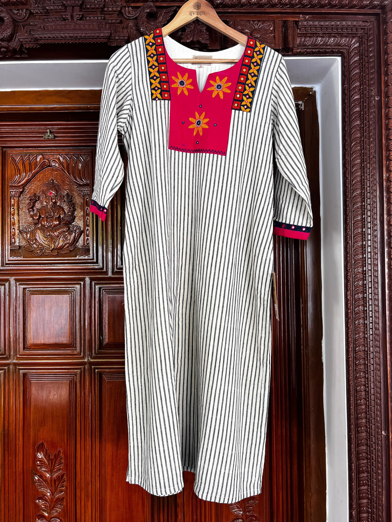 Kotpad stripes paired with a striking red yoke, finished with delicate mirror embroidery. A beautiful blend of bold detail and traditional weave, bringing depth and character to the piece. Rooted in craft, easy to wear, and timeless in appeal. Come explore it in person.