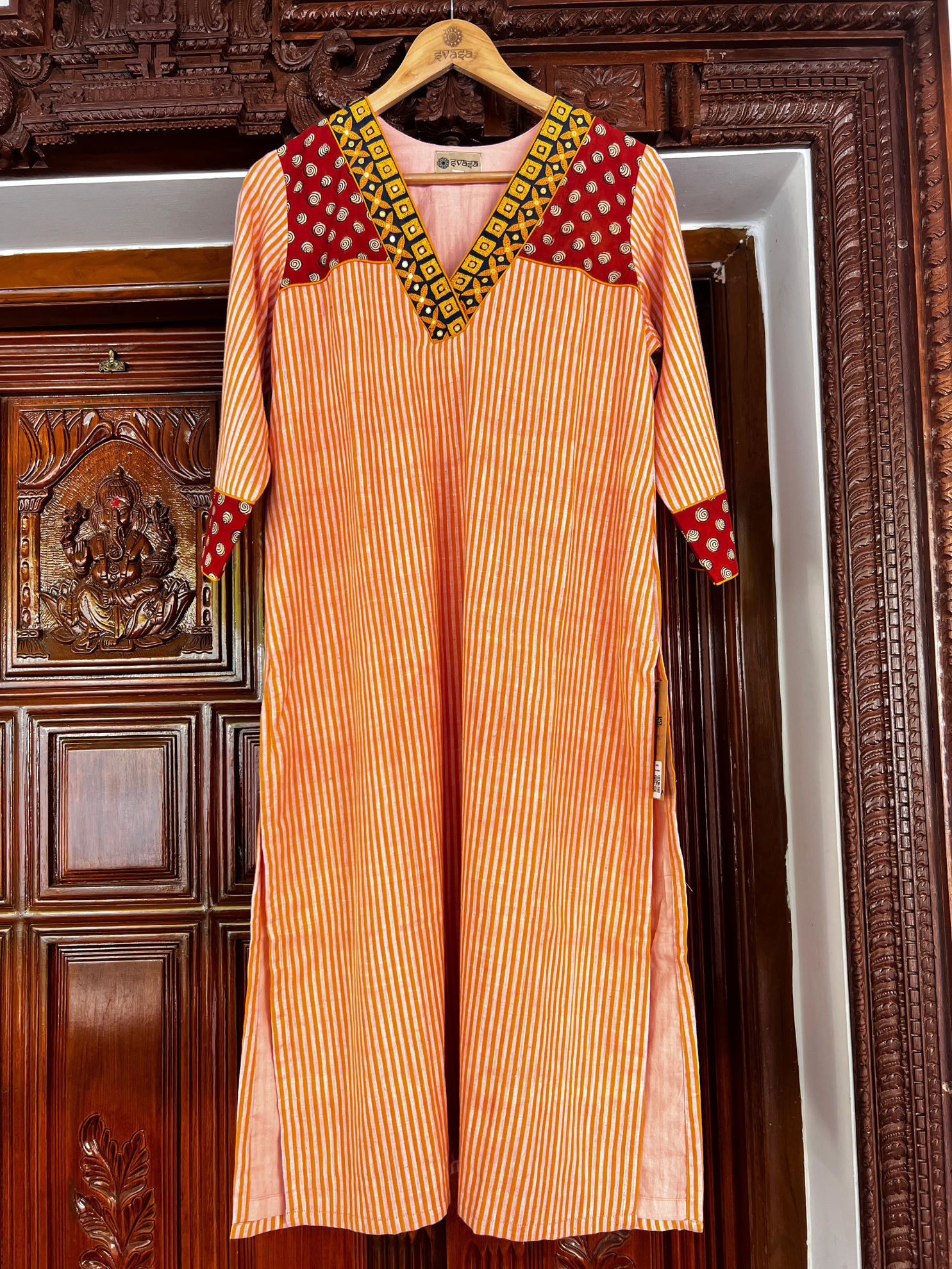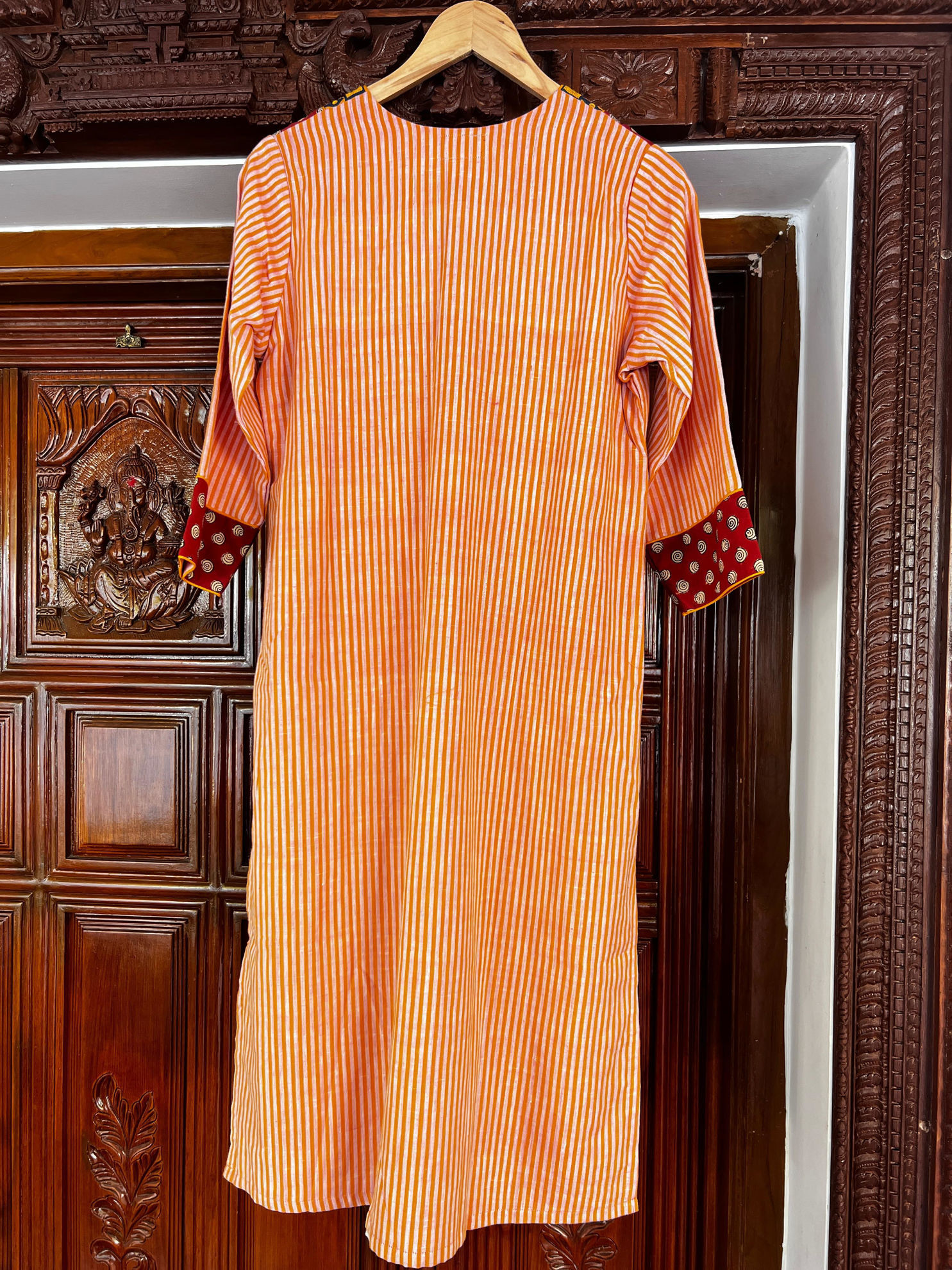 Soft peach stripes paired with a rust block-printed yoke, finished with delicate yellow mirror embroidery. A playful mix of colour, craft, and detail that brings warmth and character to the piece. Easy, vibrant, and full of handcrafted charm. Come explore it in person.