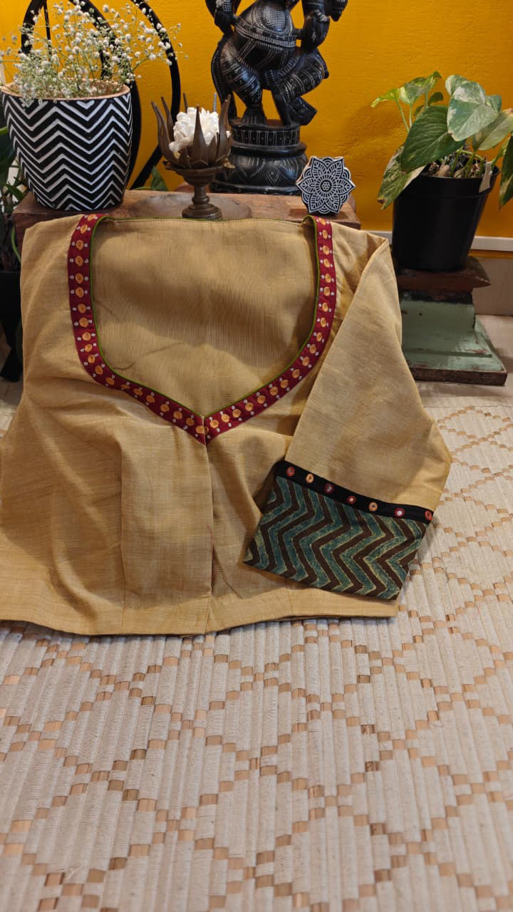 A striking yoke adorned with tribal motifs meets a base of hand block prints, creating a beautiful interplay of pattern and craft. Earthy, rooted, and quietly bold — a piece that carries the spirit of tradition with a touch of Svasa’s signature storytelling. 🪡✨