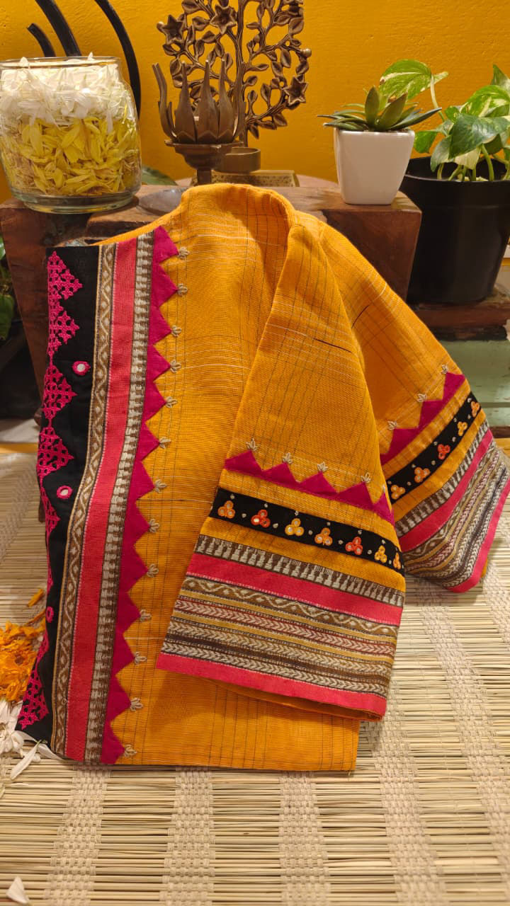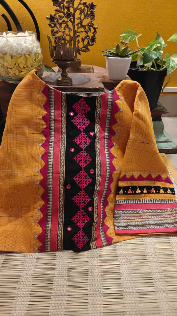 A vibrant Narayanpet in a rich turmeric hue, brought alive with bold Kutchi embroidery in a striking bright pink. The contrast is unapologetic yet beautifully balanced—each stitch standing out against the warmth of the base, adding depth, texture, and movement. There’s an earthy vibrance here… where tradition meets a playful pop of colour, creating a piece that feels rooted, spirited, and distinctly Svasa.