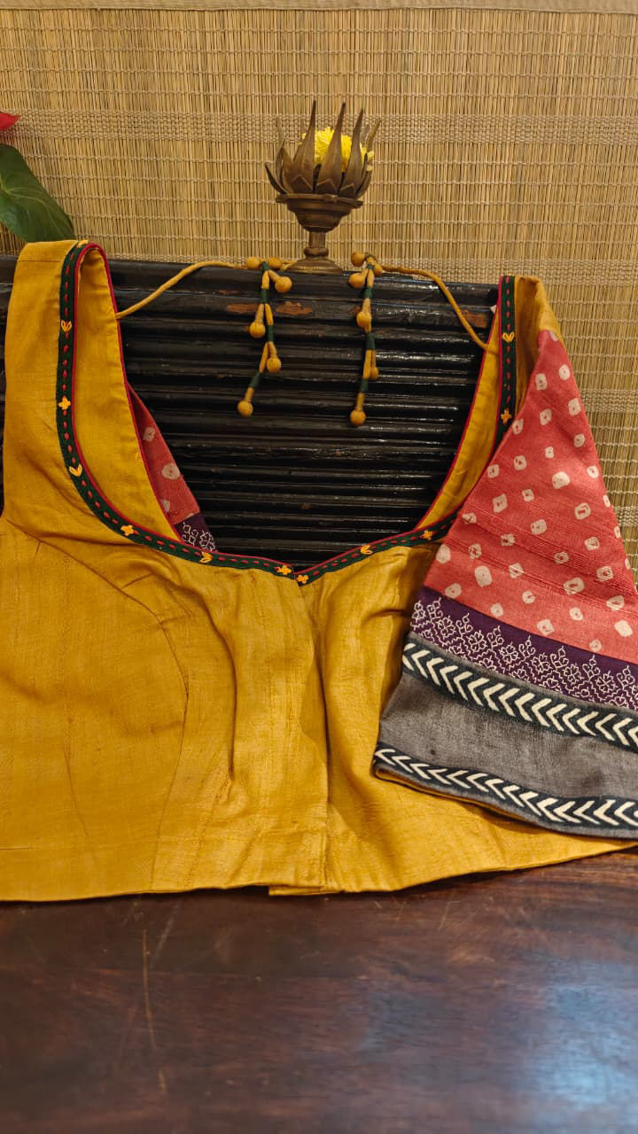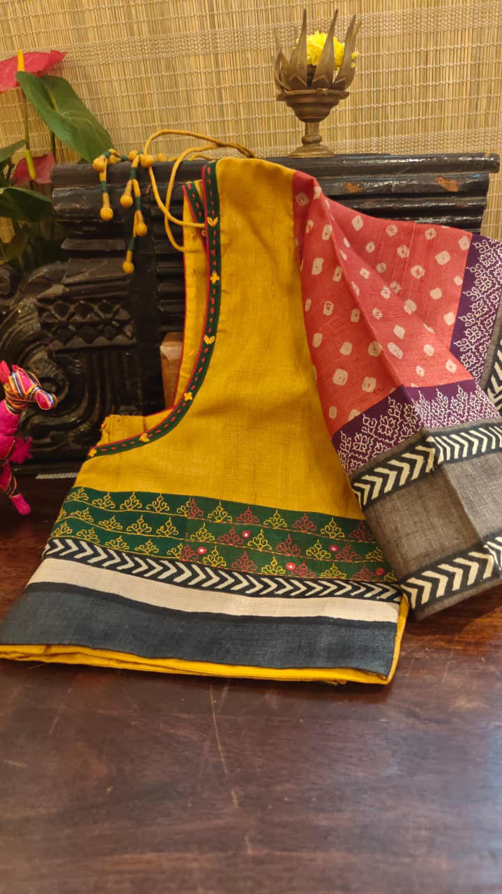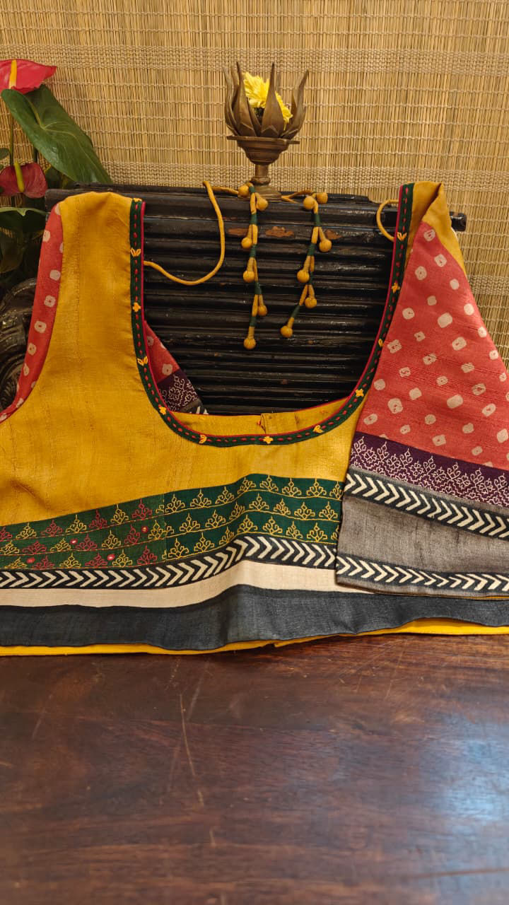 A luminous turmeric tussar silk brought alive with a vibrant mix of colours, gently layered with Kasuti embroidery that adds fine, rhythmic detail. Rooted in tradition yet lively in expression, this piece carries warmth, depth, and a distinct handcrafted character