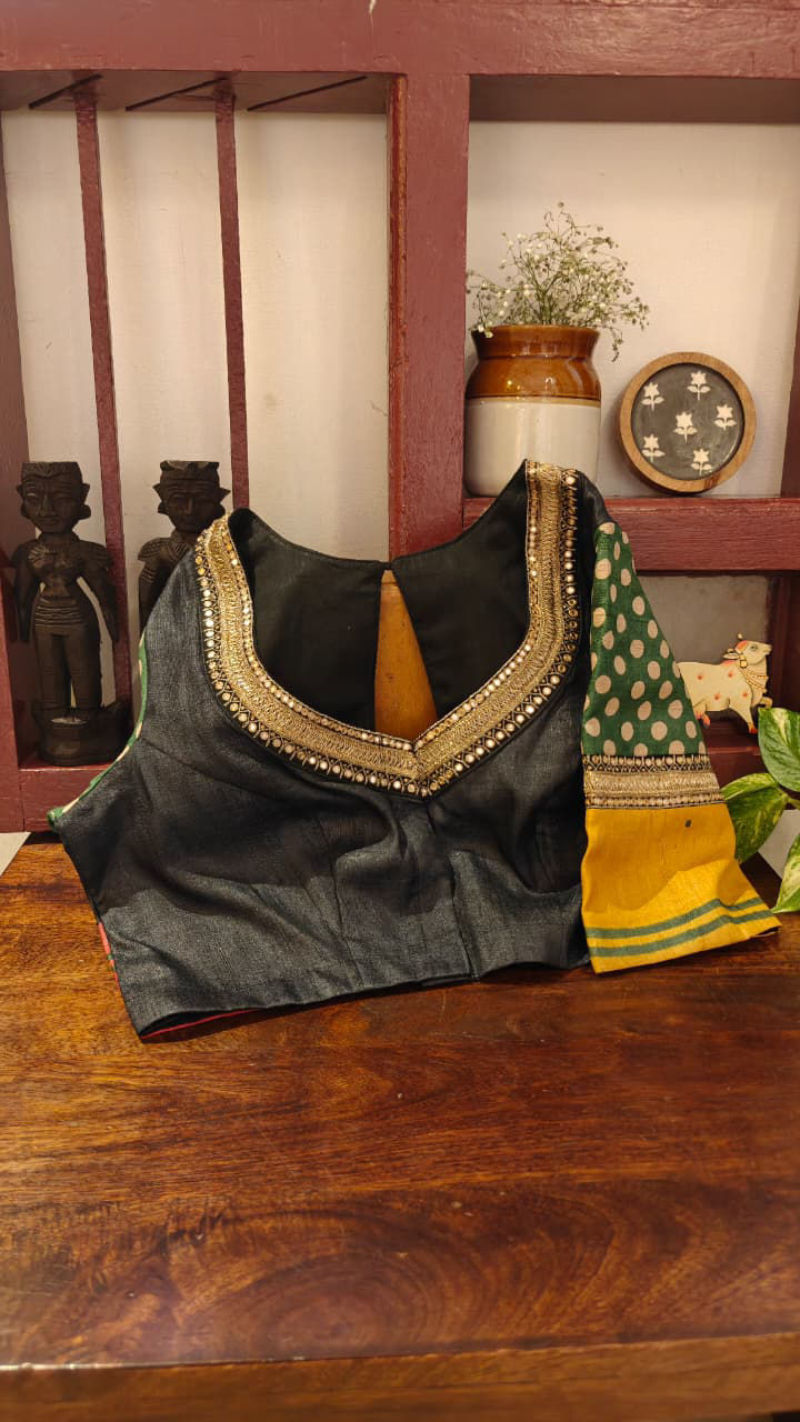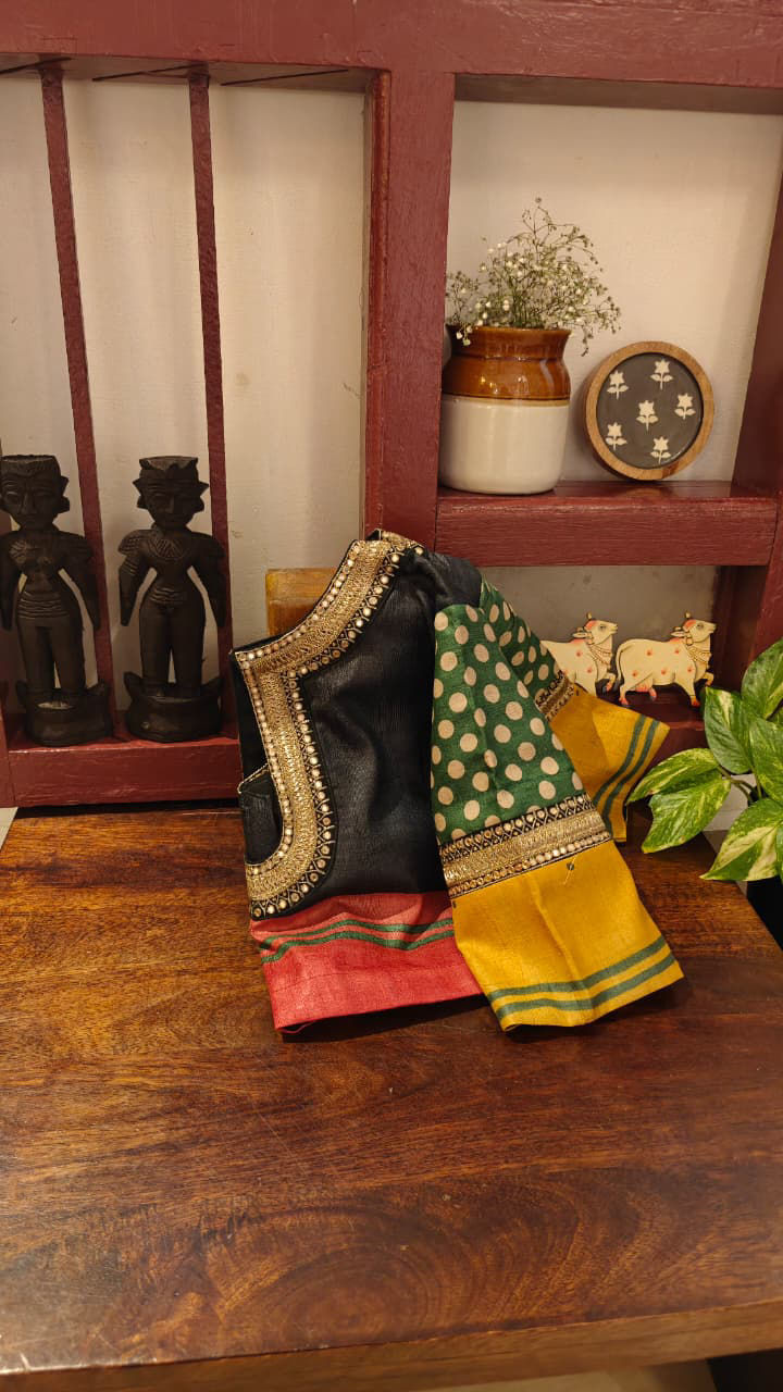 A pure Ganga Jamuna tussar silk in charcoal, red, and green, brought alive with pittan embroidery in antique shades of gold. Vintage detailing, hand-worked textures, and a colour play that feels timeless. A Svasa classic.
