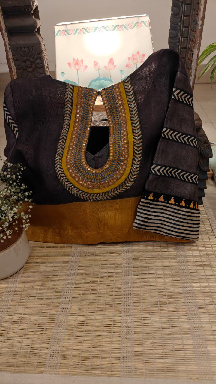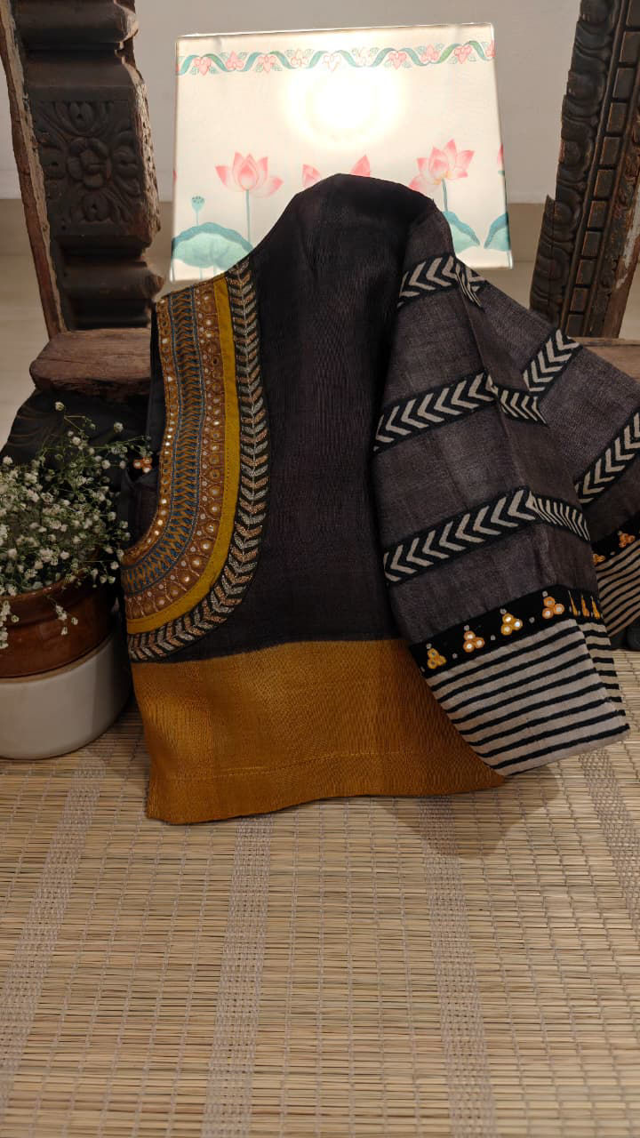 A pure Ganga Jamuna tussar silk in grey and yellow, brought alive with pittan-style detailing in antique shades of thread. Subtle, handcrafted textures meet a palette that feels soothing and timeless. A Svasa classic.