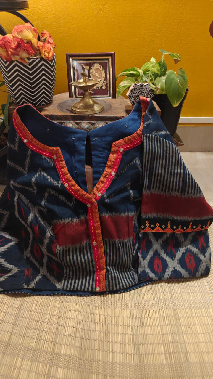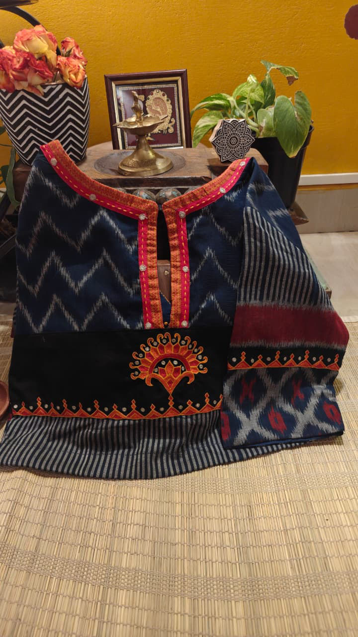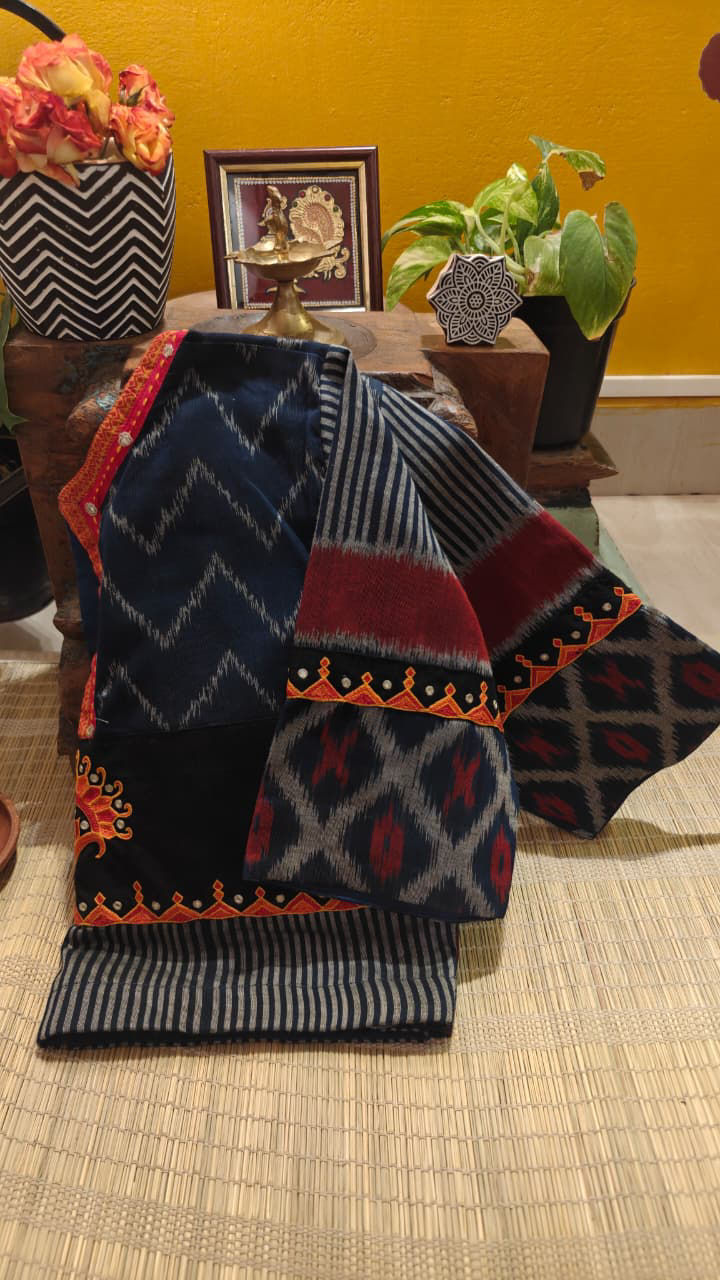 A striking fusion of ajrakh and ikkat, brought together in a seamless play of pattern and rhythm. Framed with a tribe-inspired embroidered border, rich in detail and depth, this piece carries the spirit of heritage in every thread— bold, rooted, and quietly powerful.