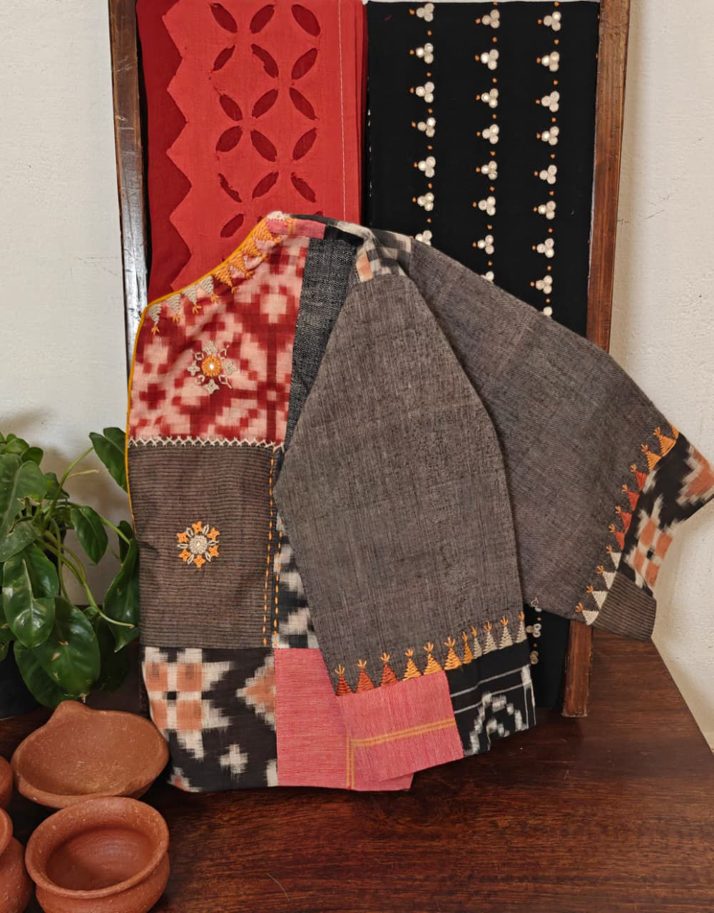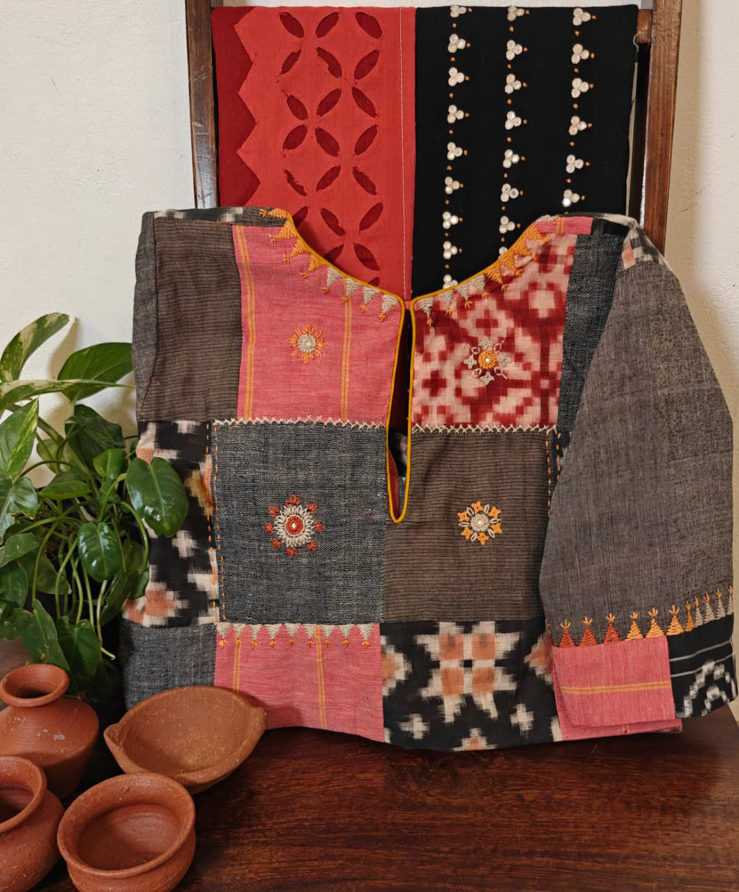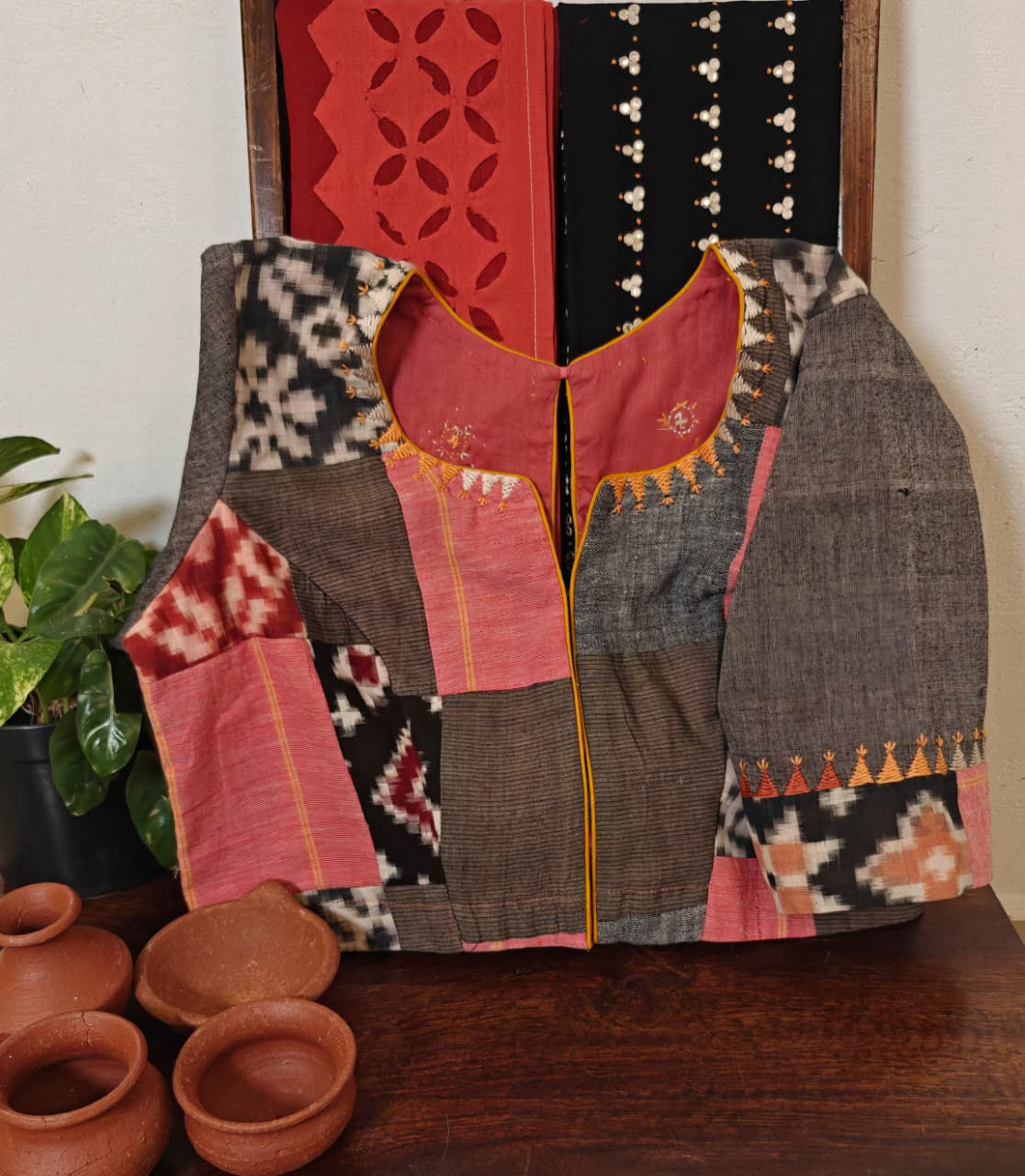 Patches of eco ikkat fused with handwoven textures, brought alive with the beauty of sustainable craft. A blouse that carries stories of heritage and conscious design. ๐Ÿชกโœจ